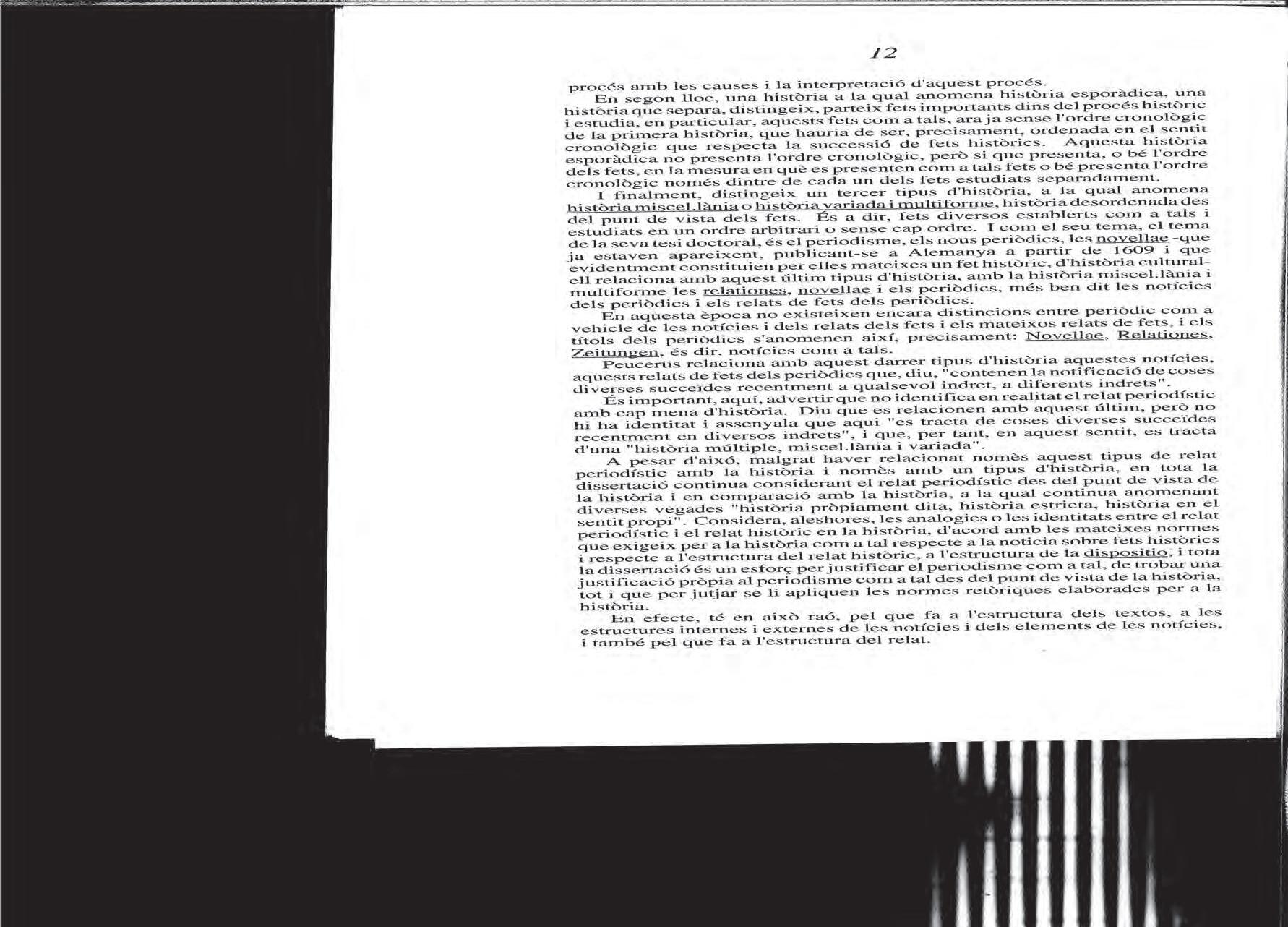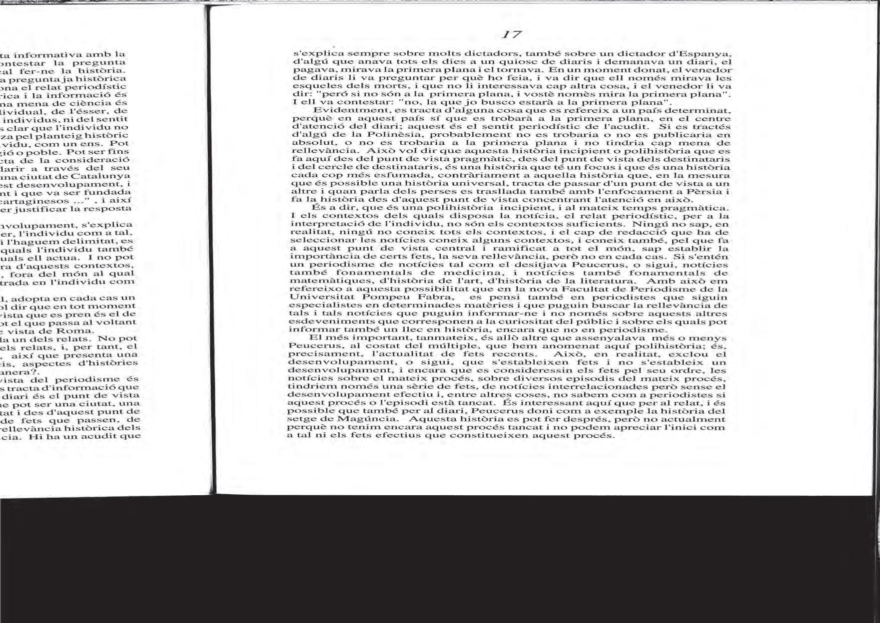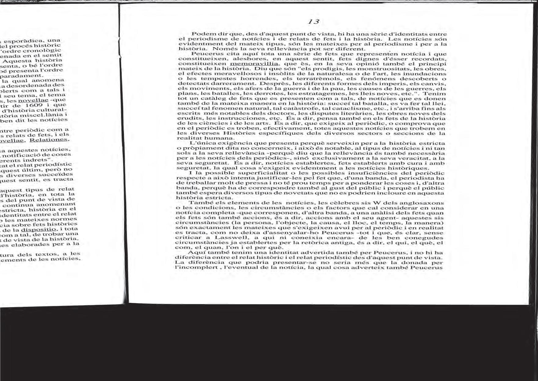 núm. 3) de la tesi doctoral de Tobias Peucer, la primera coneguda sobre periodisme llegida a Leipzig el 1690. La glosa en aquest text, on remarca les idees següents: el periodisme és història en la sincronia, història sincrònica, història necessàriament parcial i provisòria; el periodisme és polihistòria: actualitat de fets recents. També era periodista. En una conversa sobre l’evolució dels relats de fets em va dir que el lead ja el trobem en Homer.