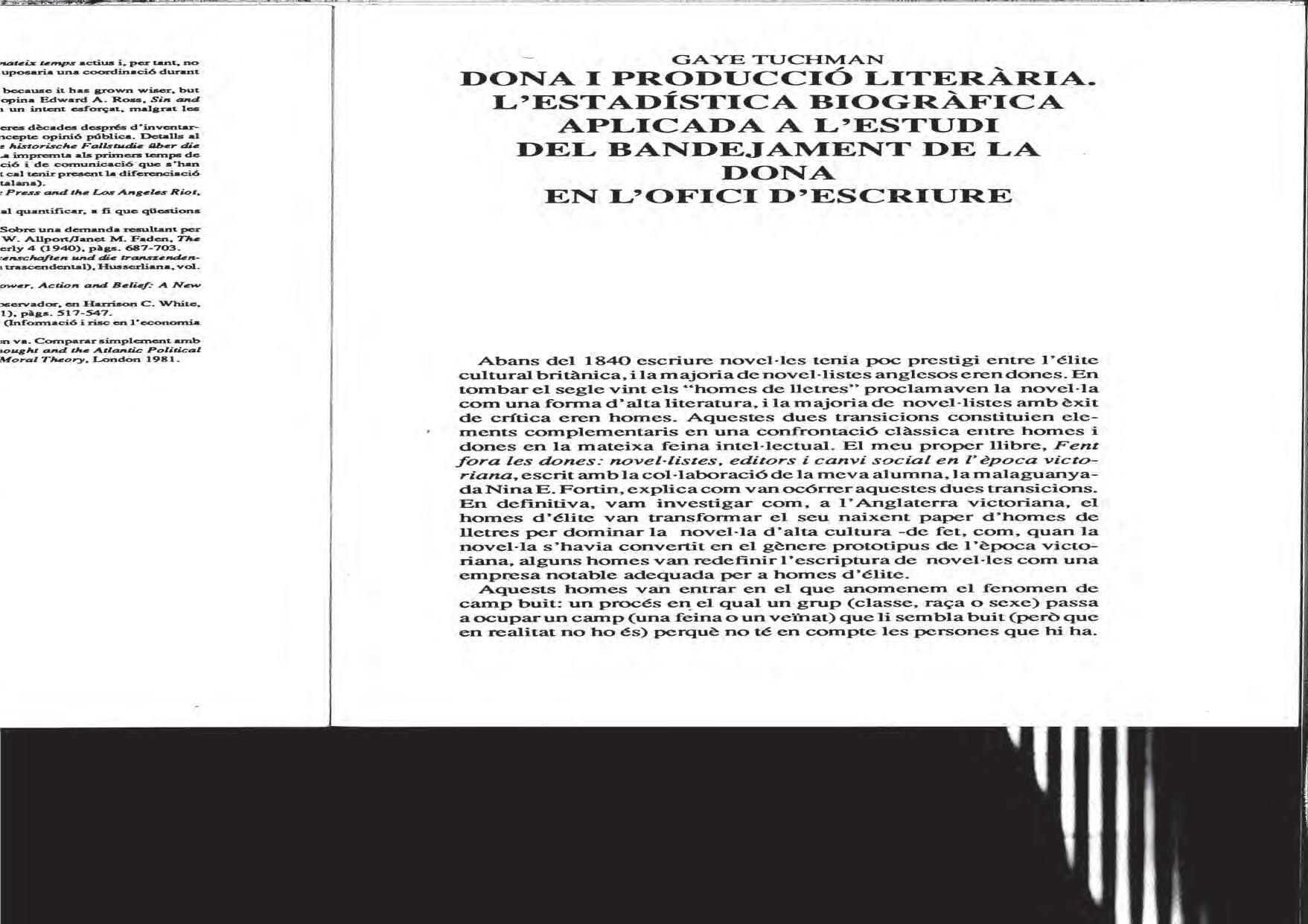 Gaye tuchman, «Dona i producció literària. L’estadística biogràfica aplicada a l’estudi del bandejament de la dona en l’ofici d’escriure», 1989.