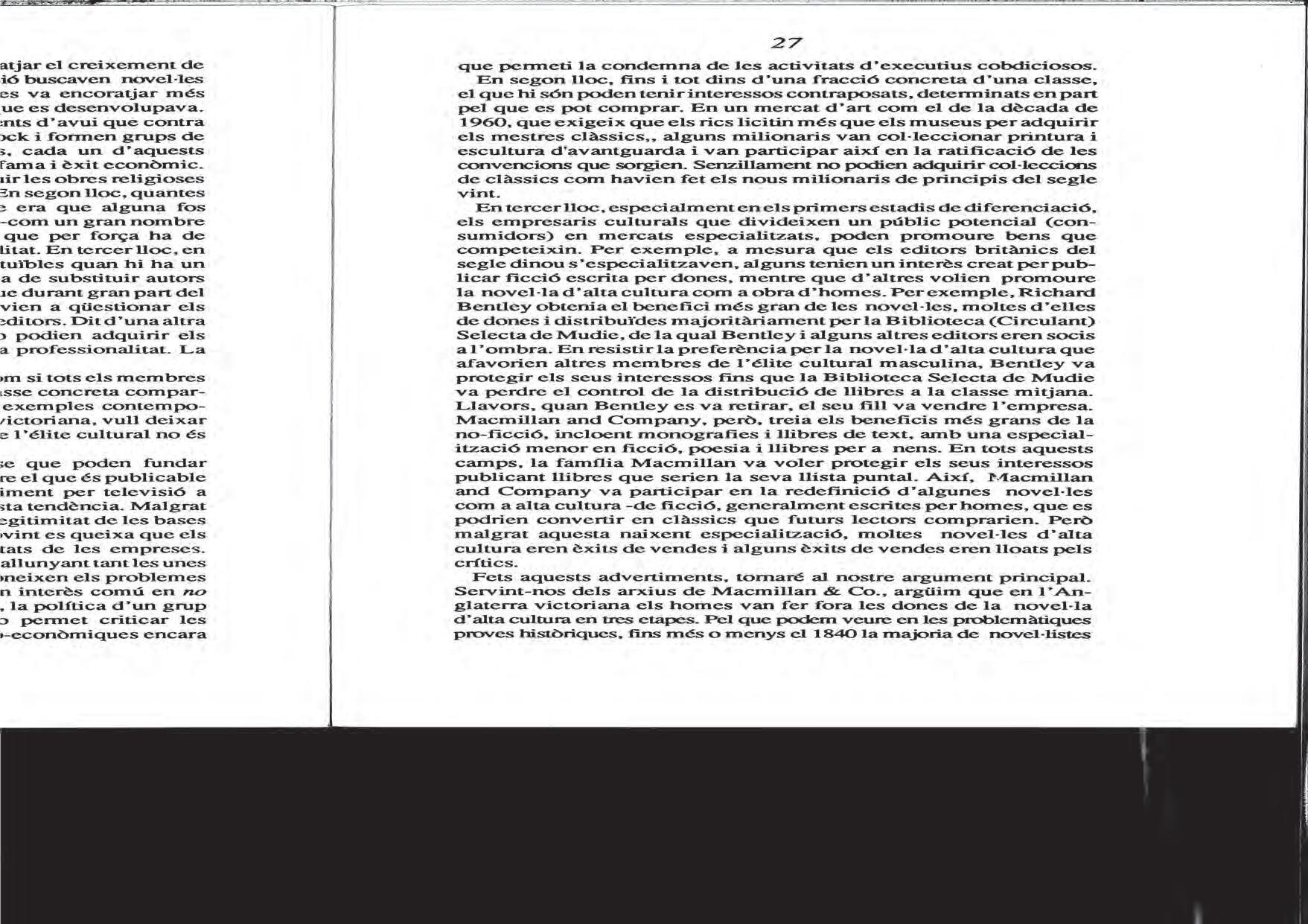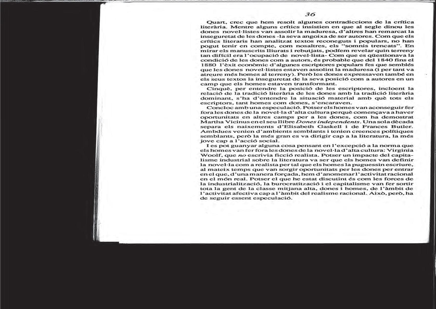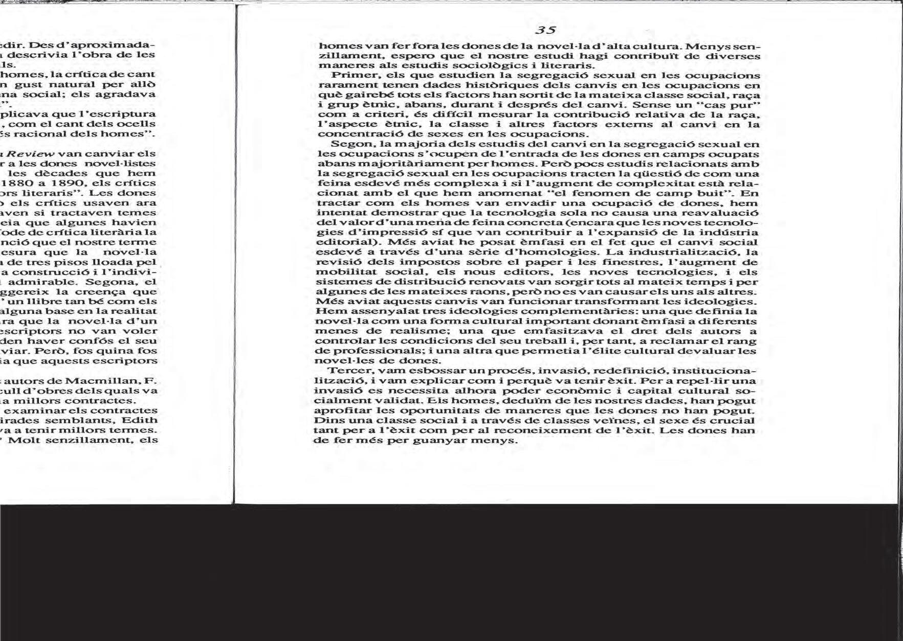 És només des d’una perspectiva crítica que hom pot identificar i minimitzar l’impacte d’aquestes narratives i, alhora, construir-ne de noves, més justes. En aquesta línia, l’article de Gaye Tuchman s’arrela en el feminisme i se’n nodreix, en identificar el fenomen a partir del qual, cap a la meitat del segle xix anglès, els homes fan fora les dones del mercat editorial de la novel·la popular. Parla, així, del període d’invasió masculina, que passa per la professionalització de l’escriptura i el consegüent augment d’interès dels escriptors homes per la novel·la, fins aleshores territori pròsper per a les escriptores i com les editorials atorguen el capital cultural als homes, i n’expulsen definitivament les escriptores. L’anàlisi de Tuchman serveix de marc interpretatiu a partir del qual es llegeixen i s’entenen moltes altres situacions en què operen les opressions de gènere.