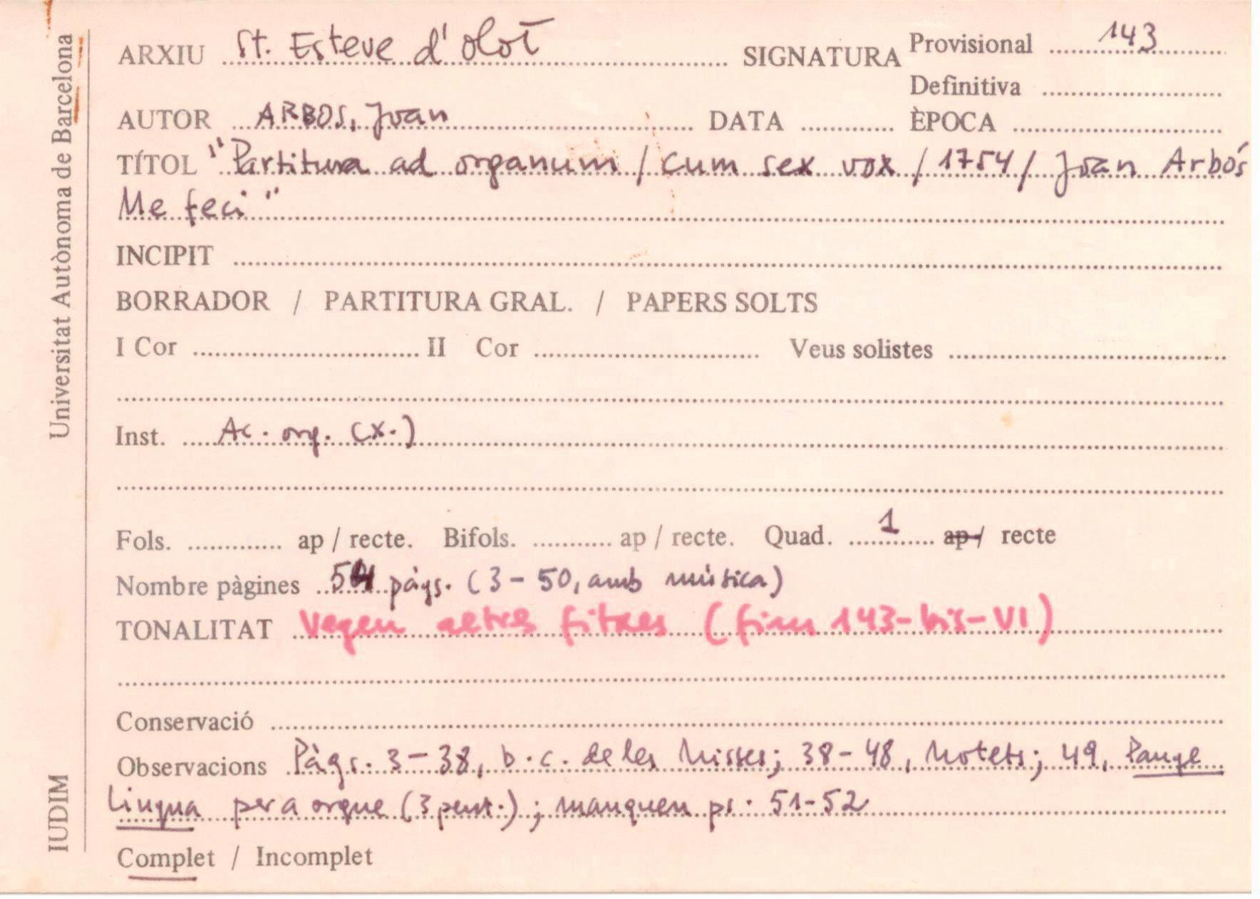 Quan a finals de 1975 començàrem a treballar l’equip del Centre de Documentació Musical de la Universitat Autònoma de Barcelona, en la tasca d’estudi i ordenació de l’Arxiu de Música de la Catedral de Tarragona, emprenguérem el treball amb una il·lusió gran i una dedicació total.13