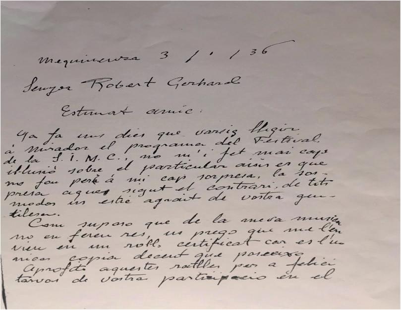 A la meva Universitat estic creant un Centre de Documentació Musical, referit sobretot a l’àrea catalana. Començarem a reunir, de manera exhaustiva, les obres dels compositors catalans que actualment viuen: fitxa de cada obra, fotocòpia o microfilm de totes les partitures no publicades i enregistrament en cassette de les obres gravades d’alguna manera (disc, cinta, cassette). Començarem a la primavera, lògicament, pels compositors més vells. Amb el temps aspirem a reunir un arxiu de tot el món musical: compositors, artistes, entitats, musicòlegs, per a estudi dels investigadors futurs. Amb això vull dirli que conto amb vostè i espero poder, amb l’ajut d’un equip d’estudiants, catalogar i fitxar tota la seva obra…11