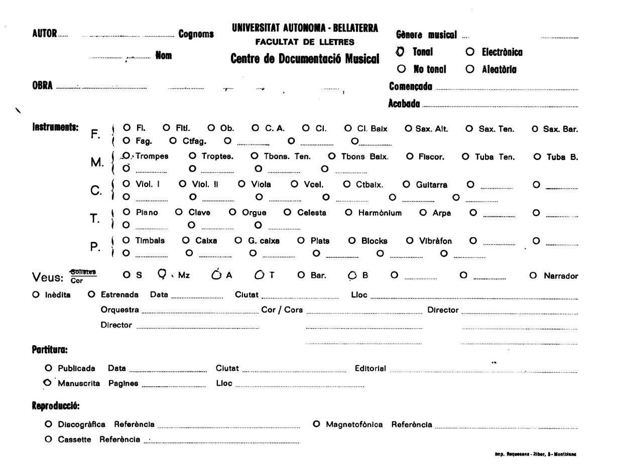 La prova de la certesa d’aquell propòsit inicial l’ofereix el model de fitxa descriptiva que va dissenyar amb un ric ventall de camps atesa l’amplitud de la seva destinació (figura 1).