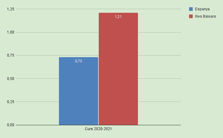 D’altra banda, si revisam l’estadística del Ministeri d’Educació, Formació Professional i Esport pel que fa a l’alumnat matriculat en l’ensenyament no universitari el curs 20202021 (vegeu https://www.educacionyfp.gob.es/servicios-al-ciudadano/estadisticas/nouniversitaria/alumnado/matriculado/2020-2021-rd.html), hi havia matriculats a l’Estat espanyol 8.232.295 alumnes, el 0,73% dels quals era alumnat TEA segons la Confederación Autismo España (2021, p 5). Si extrapolam aquesta estadística a les Illes Balears, tenint en compte el nombre d’alumnat TEA, obtenim un resultat d’un 1,21% d’alumnat no universitari TEA, és a dir, gairebé 0,5 punts percentuals més que a l’Estat espanyol (vegeu elgràfic4) i 0,21% més que la prevalença mundial, situada prop de l’1% segons el DSM-5 (Associació Americana de Psiquiatria, 2014, p.55).