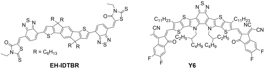 La família IDTBR ((5Z,5'Z)-5,5'-((7,7'-(4,4,9,9-tetraoctil-4,9dihidro-s-indacen[1,2-b:5,6-b']ditiofen-2,7-diil)bis(benzo[c] [1,2,5] tiadiazol-7,4-diil))bis(metanililidè))bis(3-etil-2-tioxotiazolidin-4-ona) d’NFA va ser dissenyada amb l’objectiu de complementar els espectres d’absorció del polímer donador d’electrons, el P3HT, per tal de millorar el JSC mitjançant l’absorció de fotons en un rang més ampli en l’espectre visible. L’estructura molecular de la primera versió de la família IDTBR consistia en la combinació de dues unitats acceptores d’electrons diferents (benzotiaziadol i rodanina) i un donador d’electrons (indacenditiofè) com a part central. La molècula EH-IDTBR (figura 11) és la més representativa d’aquesta família. Cha et al. van observar un augment significatiu de l’estabilitat en els dispositius basats en PffBT4T-2OD:EH-IDTR (sota les condicions estudiades) en comparació amb el seu homòleg de ful·lerè PC71BM [83]. No obstant això, l’eficiència va ser lleugerament més alta per als dispositius preparats amb PC71BM (10,5 % vs. 9,5 %, respectivament). Hu et al. estudiaren l’efecte de l’ús d’additius de dissolvents lliures d’halogen