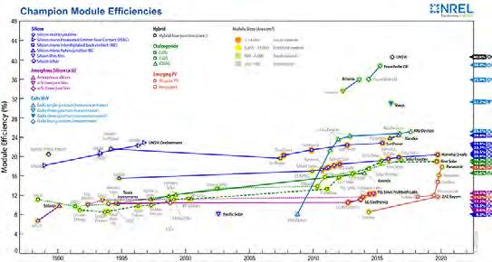 Figura 1. Gràfics que descriuen l’evolució de les eficiències rècord reportades a la literatura en funció dels anys en cèl·lules a nivell de laboratori [10] (a dalt) i en mòduls [11] (a baix) [7]. Imatges cedides pel National Renewable Energy Laboratory, Golden, CO, dels Estats Units.