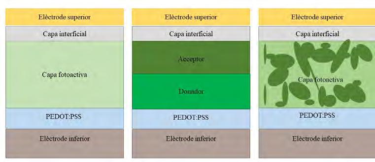 Figura 4. Esquema de la composició d’una cèl·lula solar orgànica estàndard (esquerra) amb la capa fotoactiva en forma de bicapa (centre) o com a heterounió de volum (dreta). Elaboració pròpia.