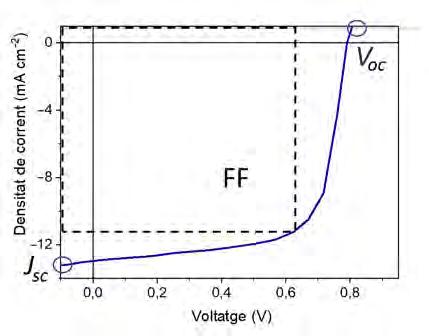 on JSC és la densitat de corrent a voltatge zero, VOC és el voltatge de lliure circulació i FF és el factor de forma, que es defineix com la part quadrada de la corba.