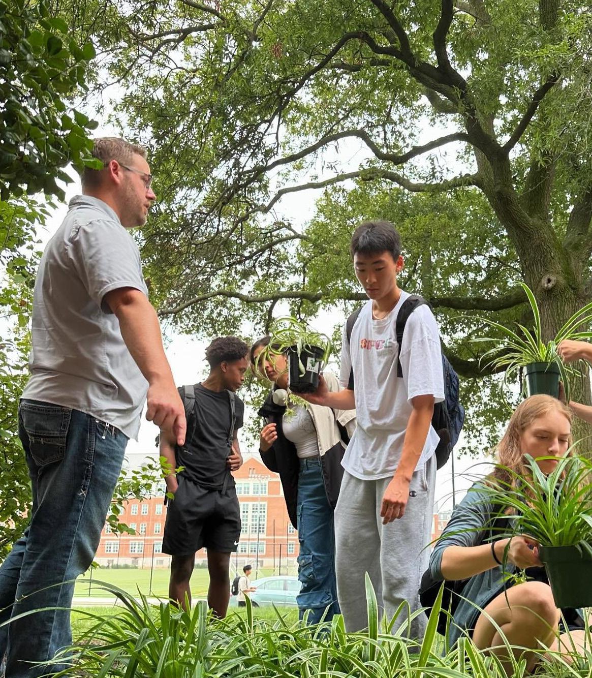 2. Faculty member Tom Mazzone assists students as they select their free dorm room plant at the annual plant giveaway.