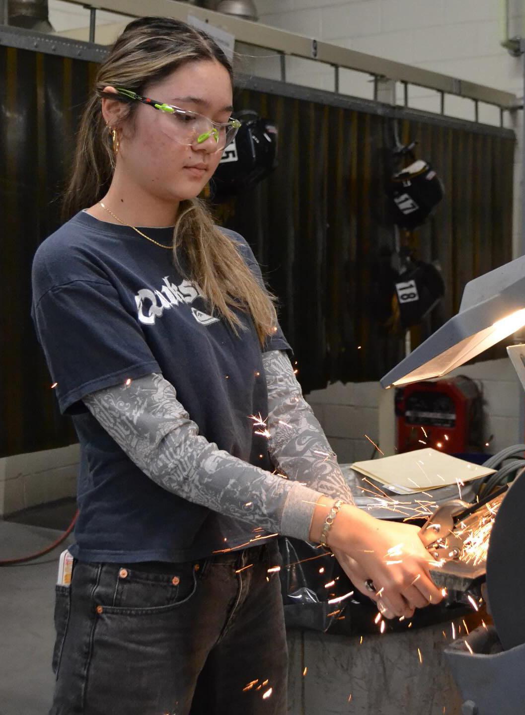 3. Mazzone's INAG250, Fundamentals of Agricultural Mechanics, covers a broad range of topics including electricity, plumbing, welding processes, and wood and metal working applications. Bella Chon, freshman Ornamental Horticulture major, is beveling a piece of metal to prepare a joint for arc welding.