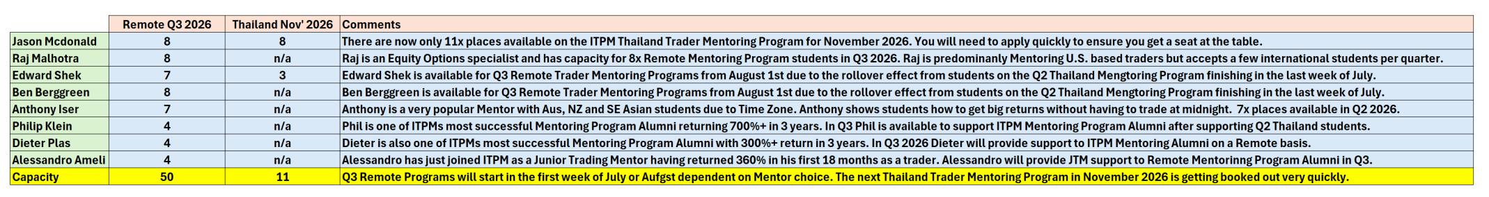 Availability of Mentors for Q3 2026 Remote Trader Mentoring Programs is as follows;-