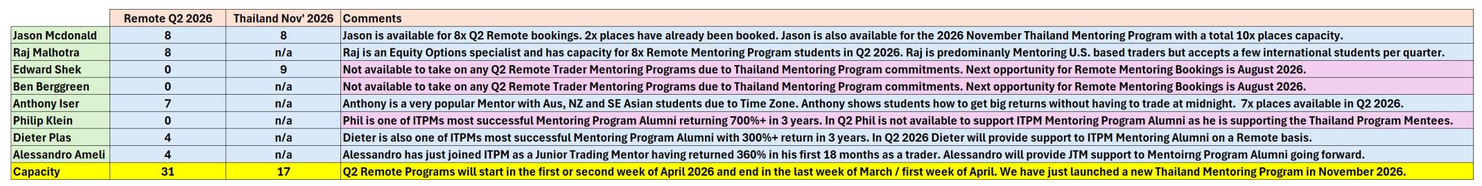 Availability of Senior Trading Mentors for Q2 2026 Remote Trader Mentoring Programs is as follows;-