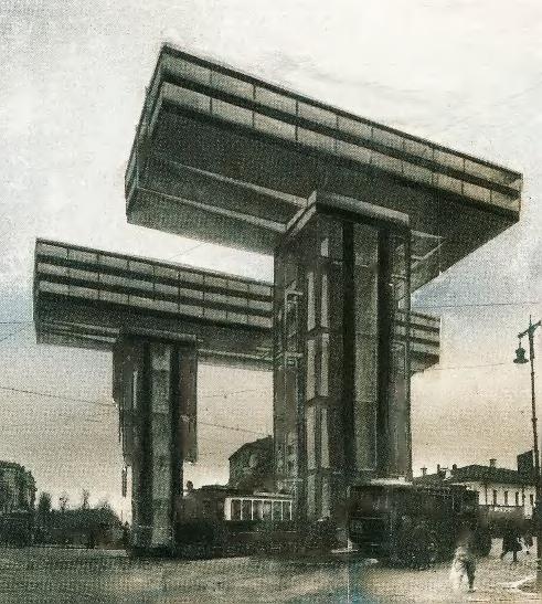 The skyscrapers stood on great elevated piers above intersections of radial and ring-rods in Moscow. These piers with their open-faced lift-shafts, support the horizontally cantilevered building. Beneath them are metro stations and bus-stops. The building is supposed to be made of steel and glass, all the parts being standardized so that no scaffolding is needed for its erection.