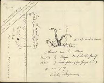 Onpage44itshowedasketchof thegumtreethatMajorMitchellʼs partyblazed(marked)ontheir returnexpeditionfromSydneyto PortlandinSept1836atLake ReposebetweenDunkeld& Glenthompson.Bythistimein 1877thetreehadbeenburntand onlypartoftheinscription remained.(SeepicturesofAlex Ingramʼsfieldbookbelow)