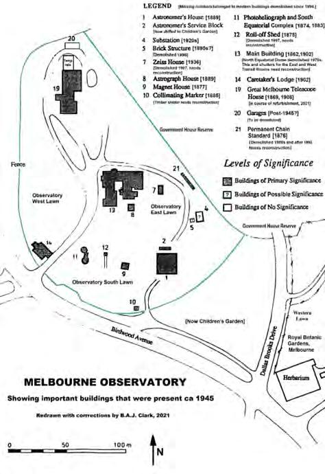 Thefollowingextractandseparate mapprovidedbyBarryClarkfromdraft paper:NATIONALANDINTERNATIONAL HERITAGEIMPORTANCEOF MELBOURNEOBSERVATORY,27 January2025,BarryA.J.Clark,PhD. Throughouthiscareer,Ellerywas remarkablyquicktoadoptappropriate newtechnologysuchastelegraphy, chronometryandelectriclighting. This requiredfacilitywiththemeasurement ofphysicalquantitiesandcalibration againststandards.Extensivesetsof massandlengthstandards,French (metric)andimperial,wereobtained andused,alongwithnewerstandards suchasthoseofelectricalresistance (Ellery1871,p6). ).Elleryʼscontinuing interestinsurveyingledhimtohavea standardsurveyorsʼchaincalibration facilitysetupontheObservatorysitein 1876(thePermanentChainStandardseeGillespie2008).