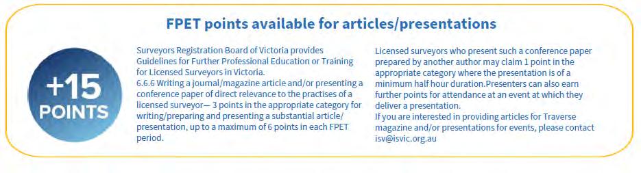 TheinformationprovidedontheISV websiteisupdatedwhenrequiredand theBoardhasjustmadeavailable bothourCodeofEthicsandCodeof ConductonthePublicfacingwebsite. TheISVCodeofEthicshaslongbeena benchmarkforallLicensedSurveyors inVictoria. Themostimportantethic andwhatsetsISVandLicensed SurveyorsapartisʻAmemberʼs responsibilityforthewelfareand rightsofthecommunityshallcome beforetheirresponsibilitytothe professionofsurveying,tosectionalor privateinterestsortoothersurveyors.ʼ AllLicensedsurveyorsareregistered bytheSurveyorsRegistrationBoardof Victoriaandhaveadutytothestate andthecommunitytoensuregood titlesareissuedandtheCommunity andcadastreareprotected,itisnot justdoingwhatourclientwants. This isthesameformanyofthe stakeholdersinvolvedintheprocess, betheyCouncilOfficers,LandUse Victoriastafforserviceauthorities, theyaretheretoensurethesafety, amenityandongoingbenefittoall peopleinthecommunitynowandin thefuture.