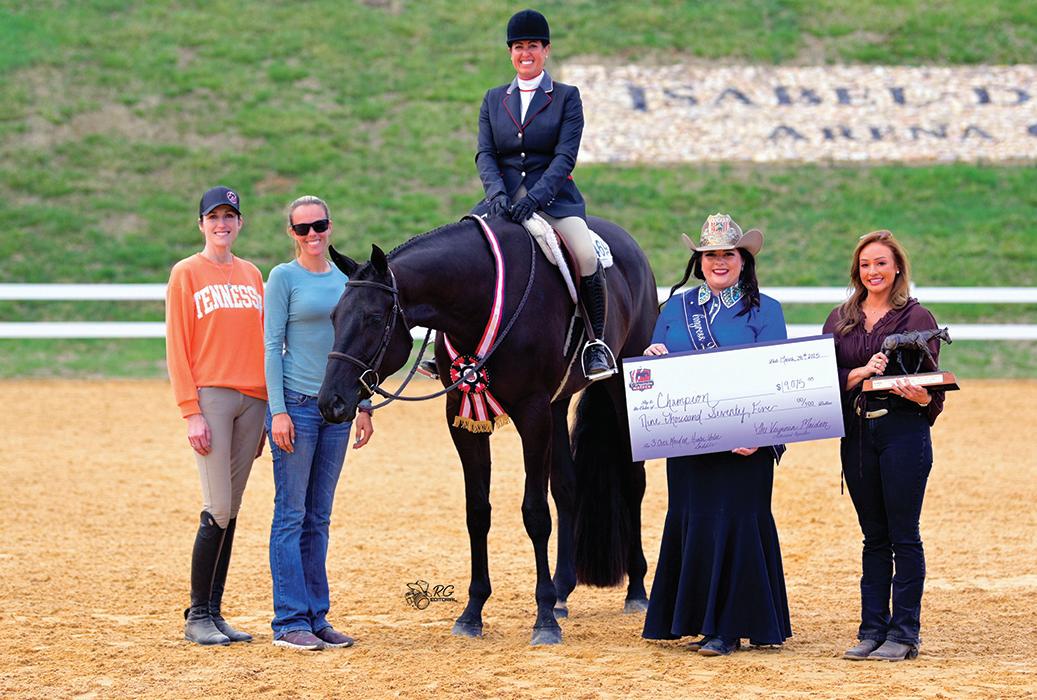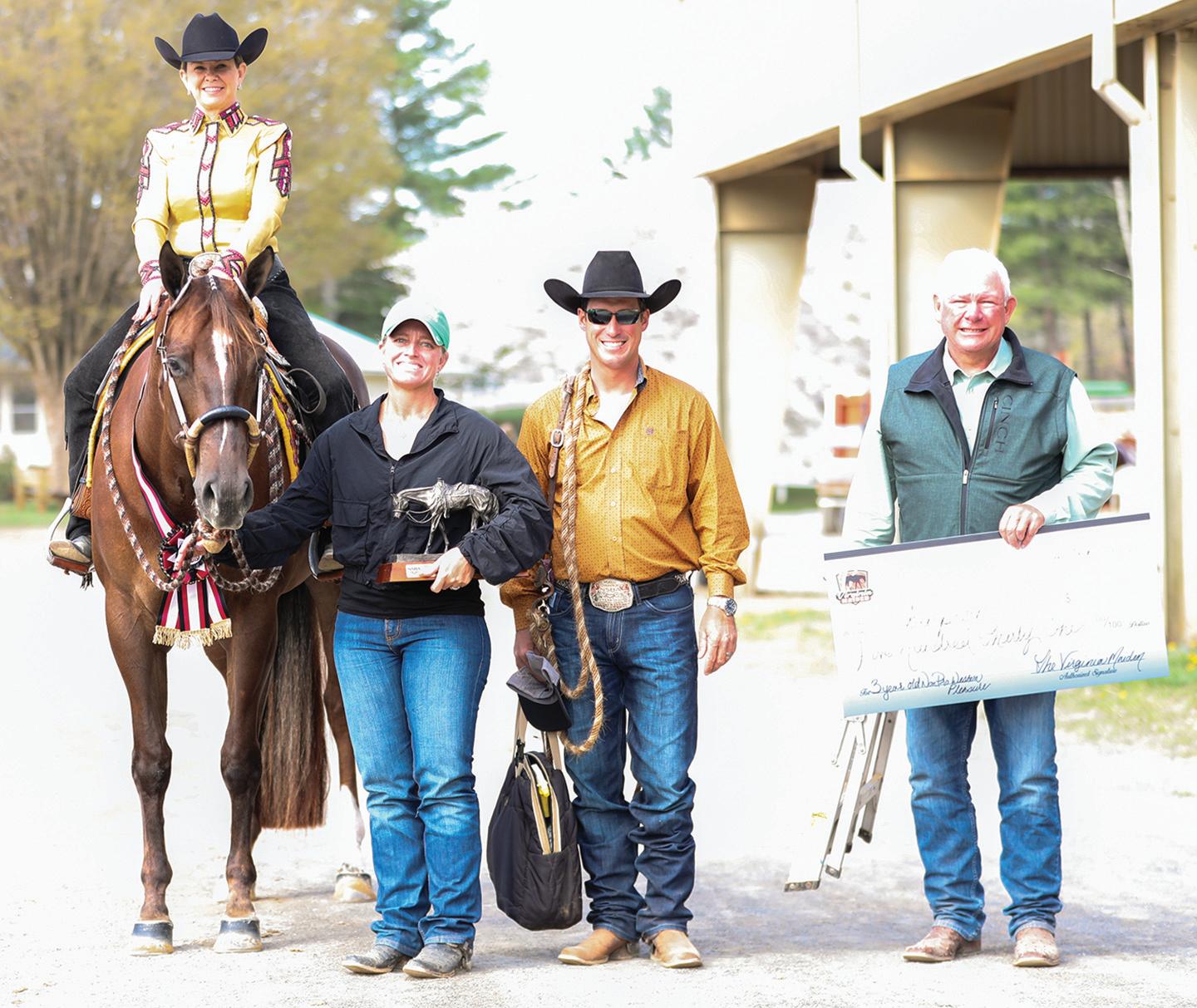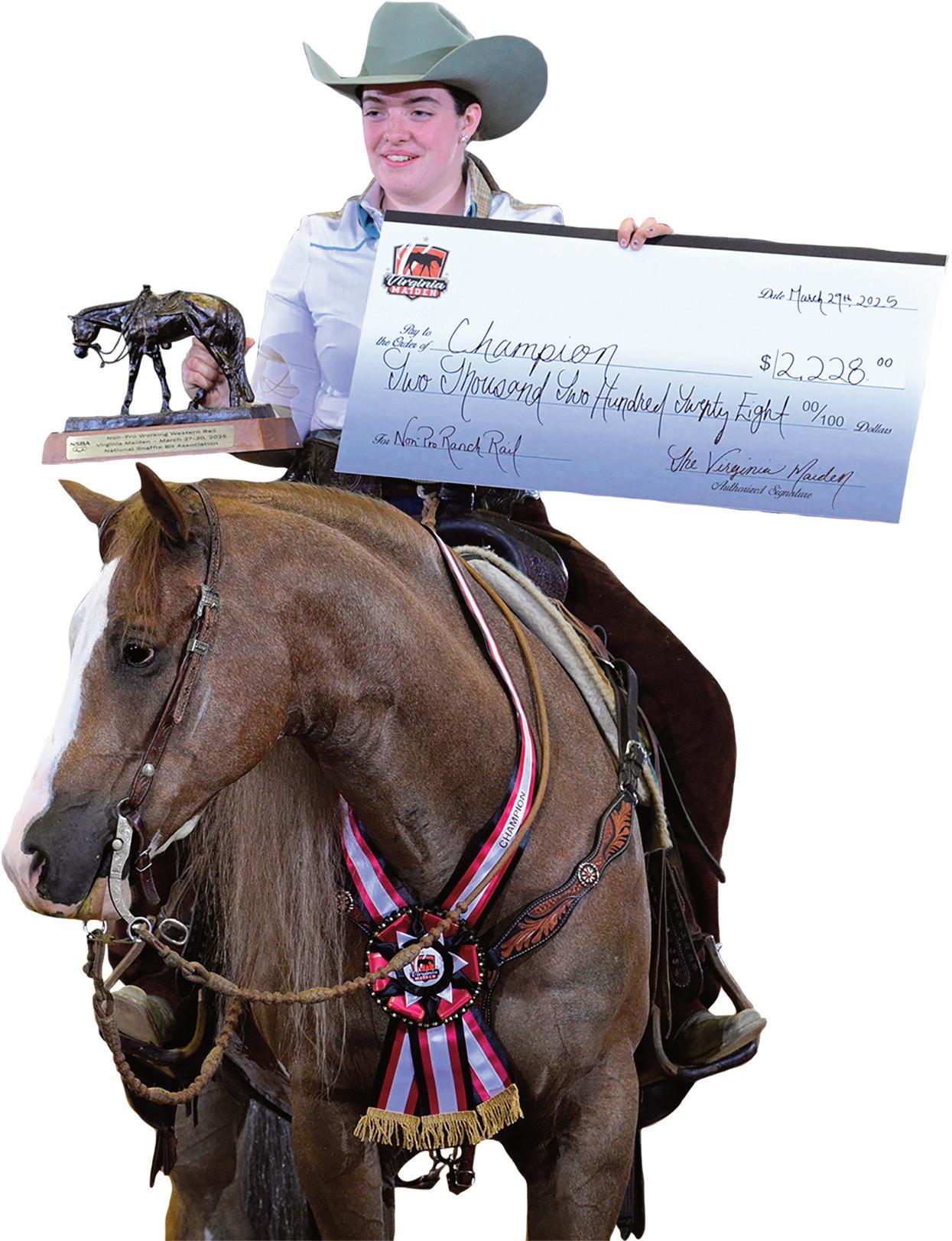 Shannon Curl Holbin rides Ten Kinda Southern (top) to a unanimous win in the 2025 Virginia Maiden 3-Year-Old & Over Western Pleasure class held March 29 in Lexington. Below that Farley McLendon collects a check for $9,075 for winning the 3-Year-Old & Over Maiden Hunter Under Saddle with Speakeasyy. On the opposite page, Becca Sschaffhauser collects a $2,228 check for winning the All-Age Non-Pro Ranch Rail with Crowd Pleaser.