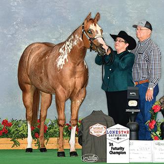 Shesa Real Pleasure – A 1996 sorrel overo mare by An Awesome Mister (QH) and out of Foolish Pleasures (QH), “Riley” enjoyed a successful show career before becoming a renowned broodmare. She accumulated 677 lifetime APHA points, eight Registers of Merit and six Superiors. Riley produced 15 foals, who have earned more than 50 APHA and National Snaffle Bit Association world and reserve world championships and over 10,000 APHA points. Ken, Karen and Amalie Kennedy of Fort Smith, Arkansas, owned the mare.