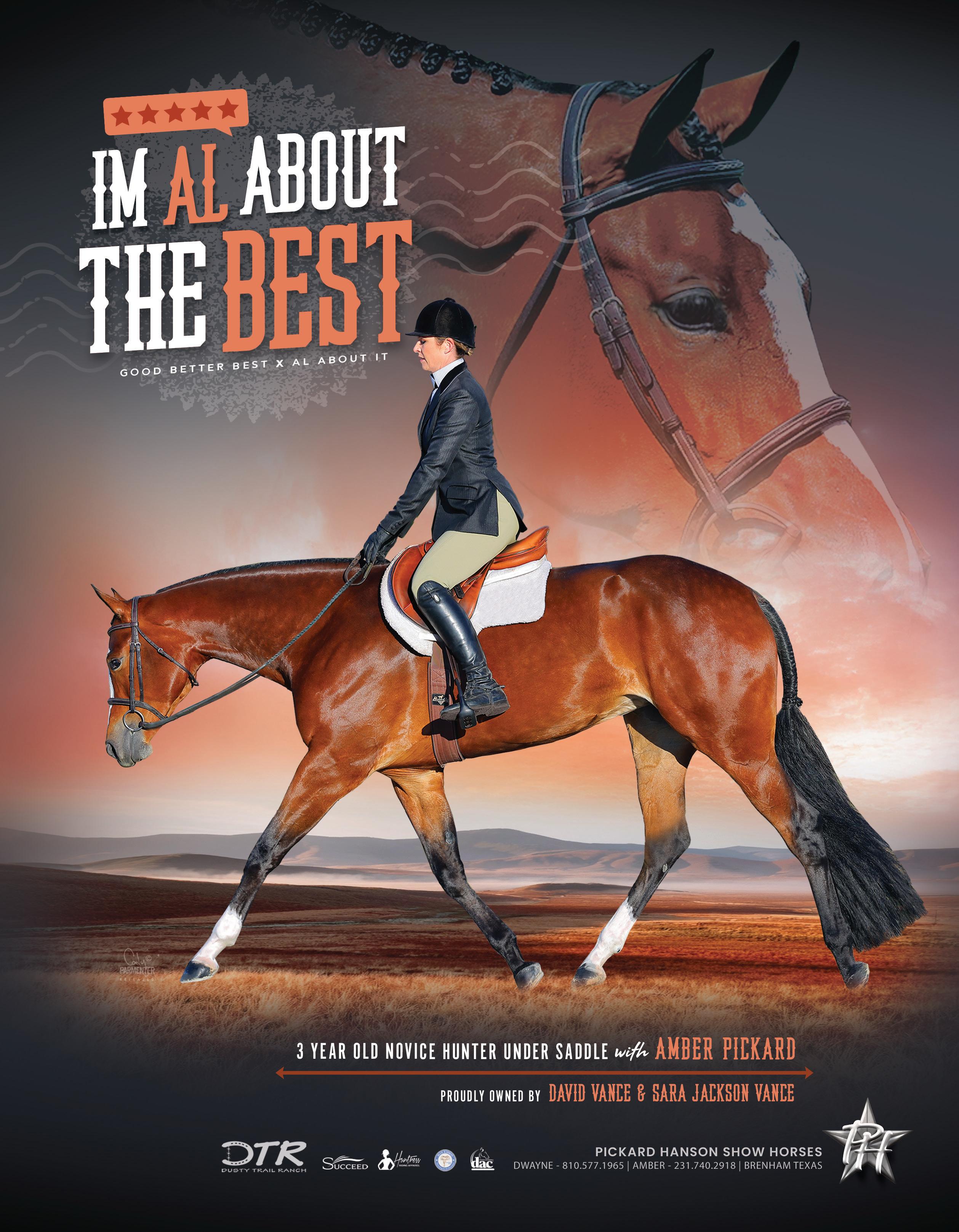 “She’s got big shoes to fill! My goal for her is to have a successful 3year-old year, and then I have hopes she will be my amateur replacement since I have retired Al Be Bleu and sold Good Ol Boys Club,” she said.