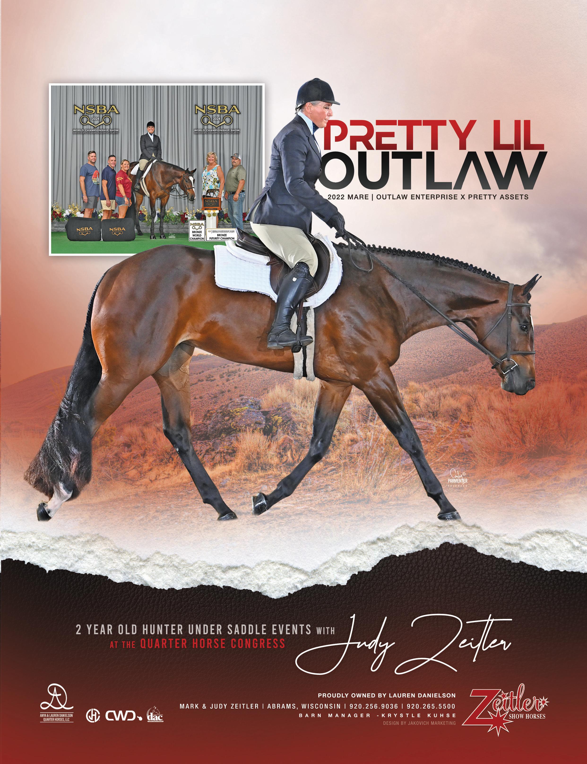 • My Sisters A Outlaw, a 2022 mare by Outlaw Enterprise out of Lookin Hot Sister, will make her debut in a Maiden Hunter Under Saddle class with Jamie English in 2025.
