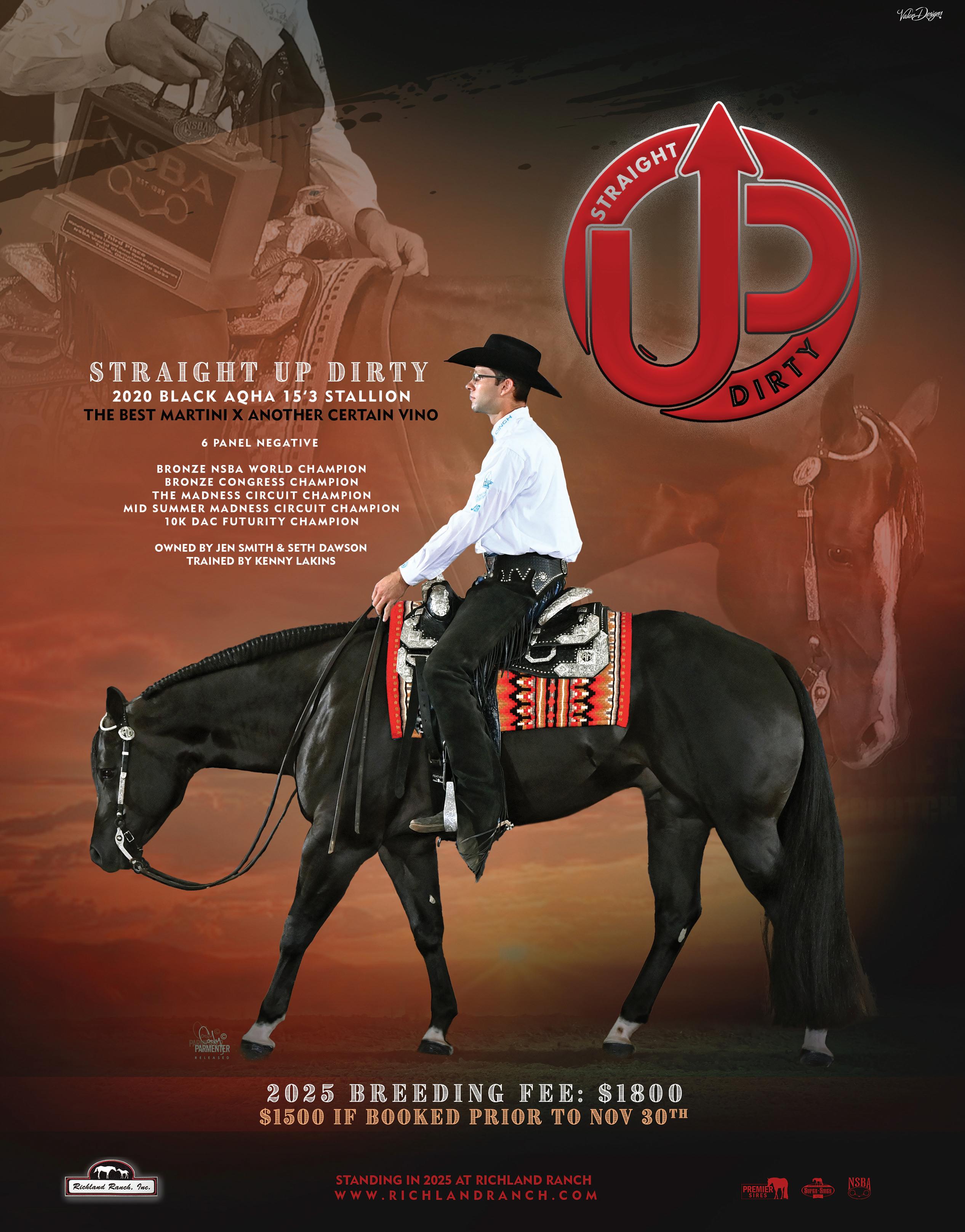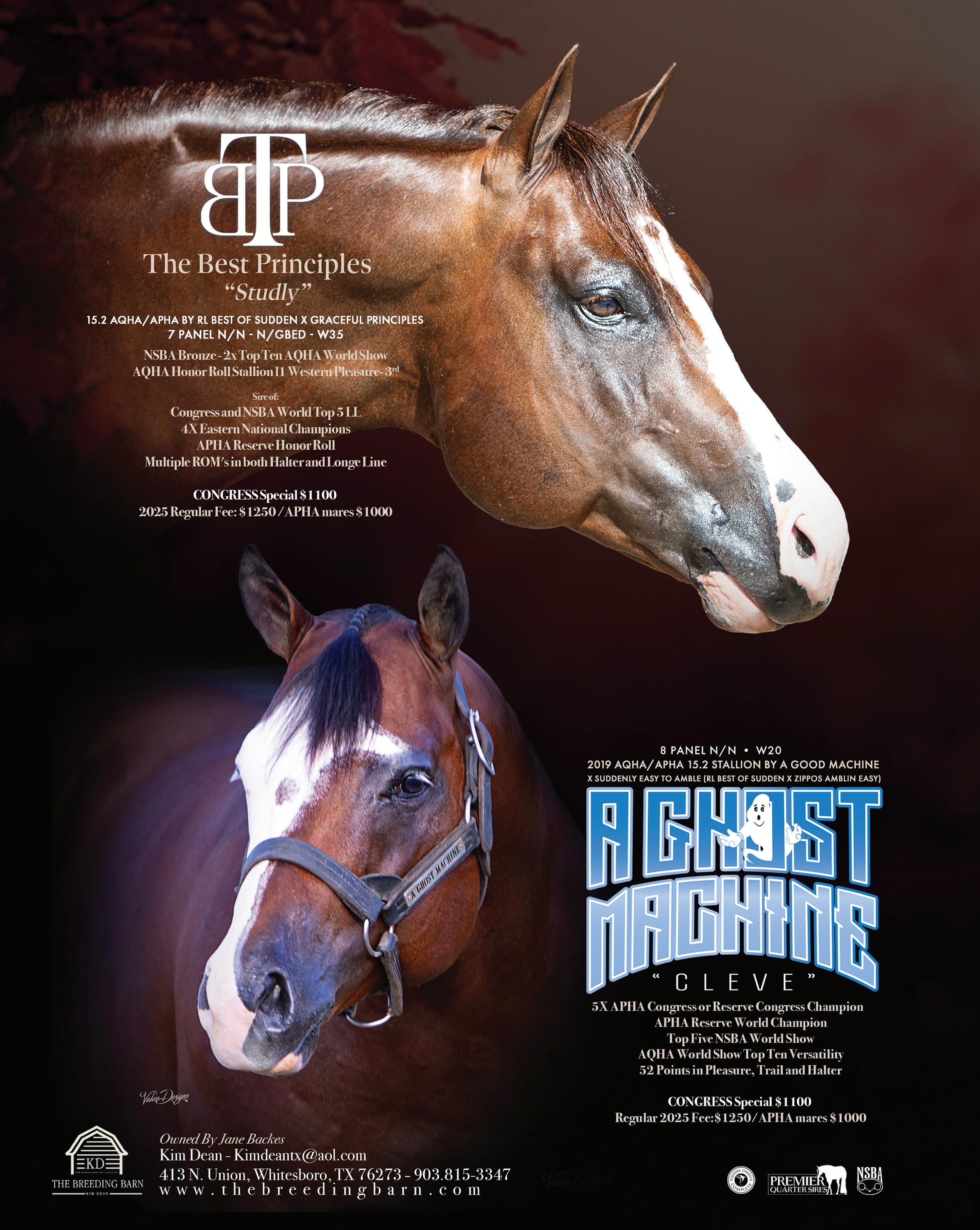 Some of the broodmares in Terlizzi’s band include: Makin The Boys Blue, dam of multiple Congress Champion Al Be Bleu; Too Lazy To Pass, dam of NSBA BCF Champion and Reserve Congress Champion, Pinball Machine; OnlyAfraid InTheDark, dam of multiple World and Congress Champions; Detailed In Sky Blue, dam of NSBA World Champion, Because Eye Said So.