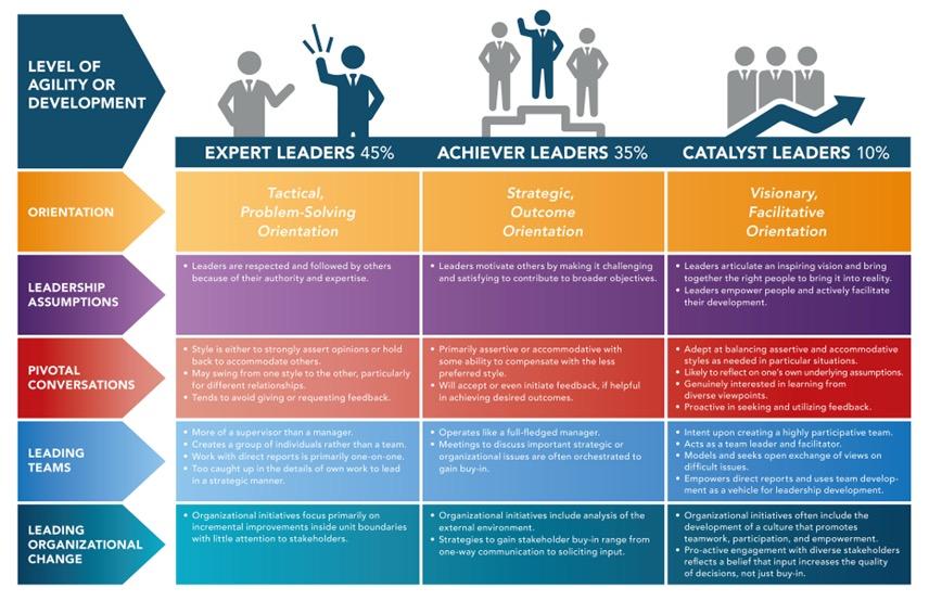 The chart opposite presents abbreviated profiles of leaders and managers at three levels of agility or development.