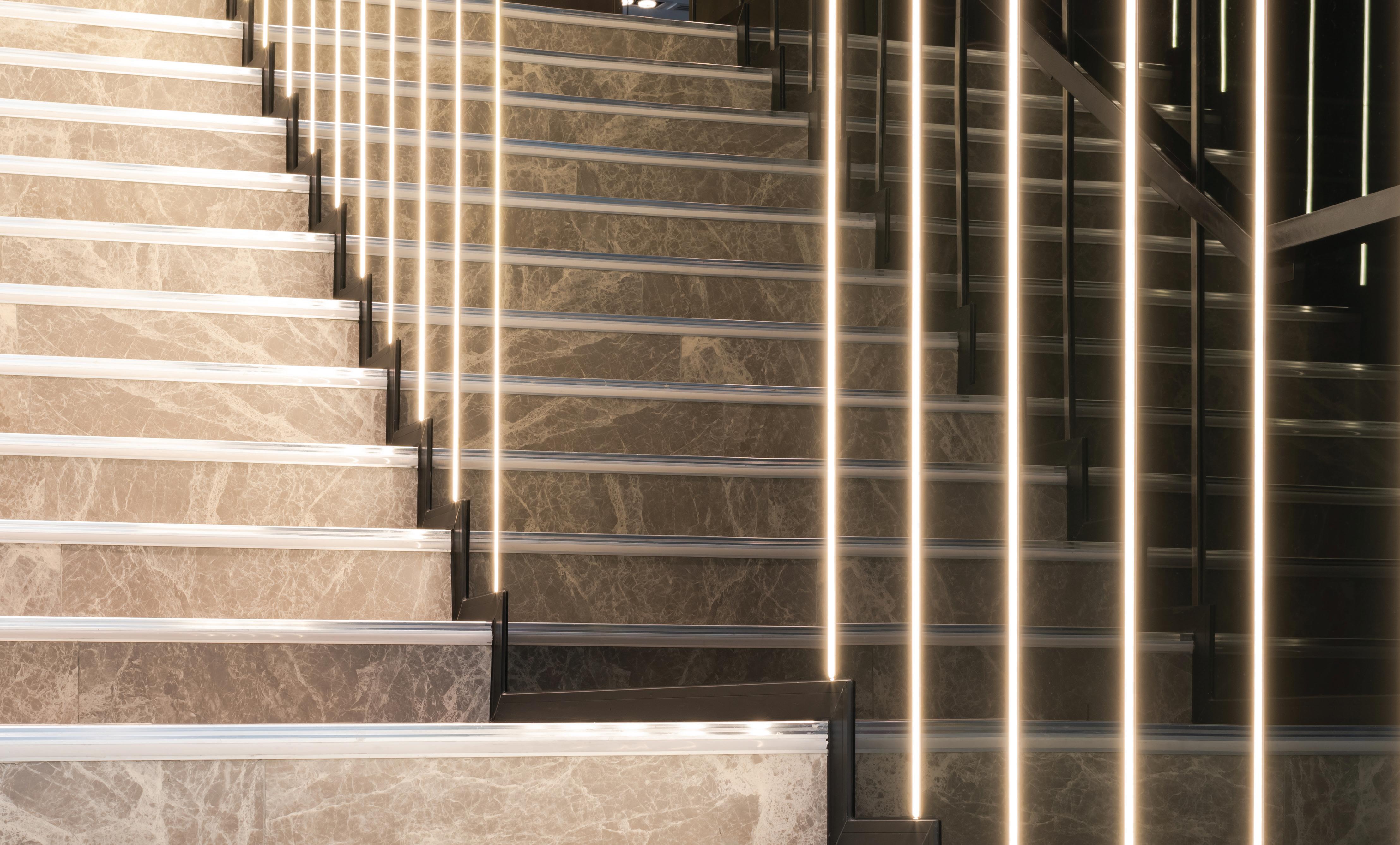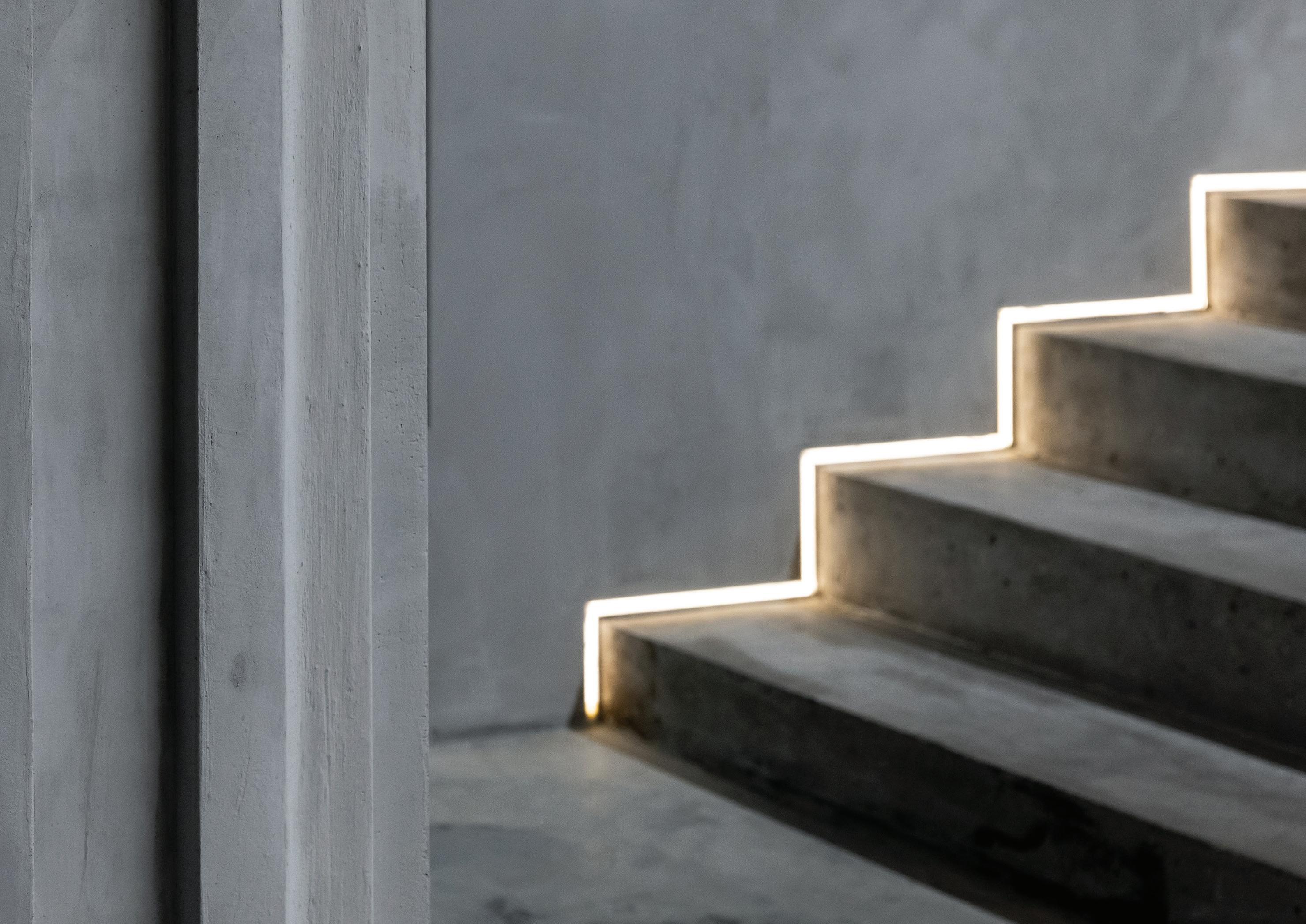 This surface-mounted aluminium profile is designed to illuminate staircases. Featuring an upward diffuser that defines each step, providing safety and visibility, especially in low-light environments like cinemas.