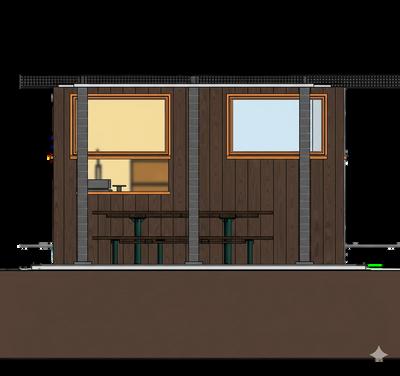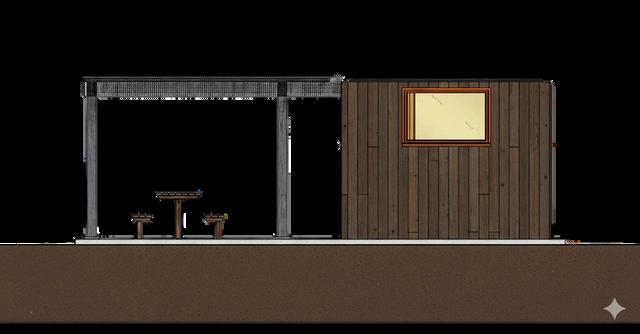 warmtimberbox acharcoalsteel pergolaframes servicewindow (whereguestsare servedcustom bowlsfromrich broths,springy noodles,layered toppings,and crunchyadd-ons.)