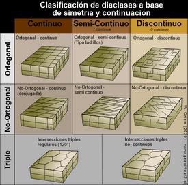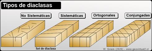 El origen más aceptado para la formación de las diaclasas tectónicas establece que éstas se abren perpendicularmente al esfuerzo principal mínimo –σ₃ – sobre el plano que contiene a los esfuerzos principales máximo –σ₁ – y medio –σ₂ – (Fossen, 2010), siendo la dirección de mayor elongación paralela al esfuerzo principal máximo (σ₁).