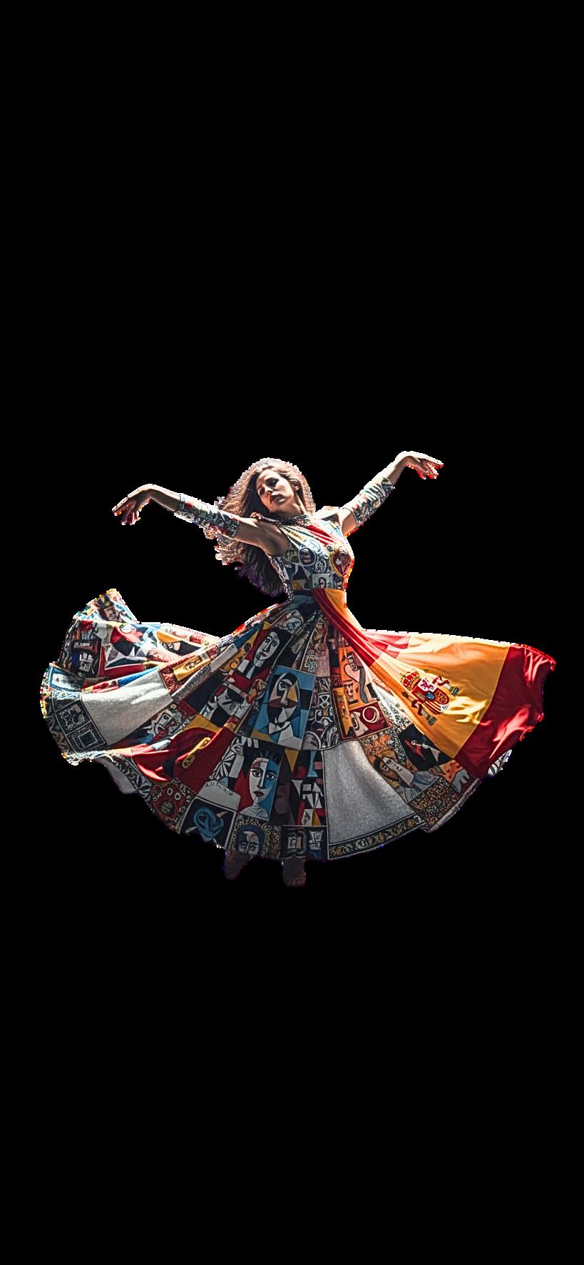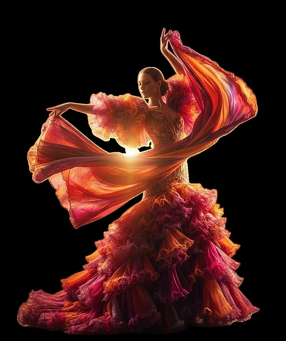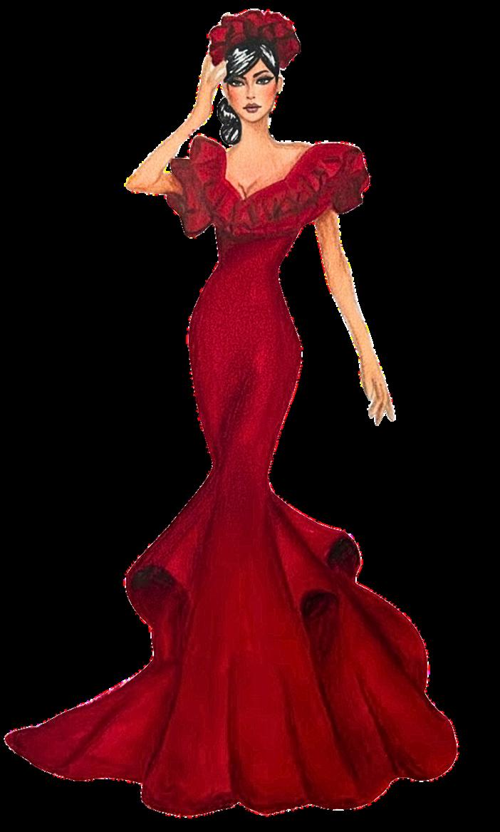 sta ilustración captura la esencia estética del arte flamenco y su indumentaria tradicional, el vestido de flamenca, La prenda busca expresar la pasión, el dramatismo y la sensualidad andaluza
