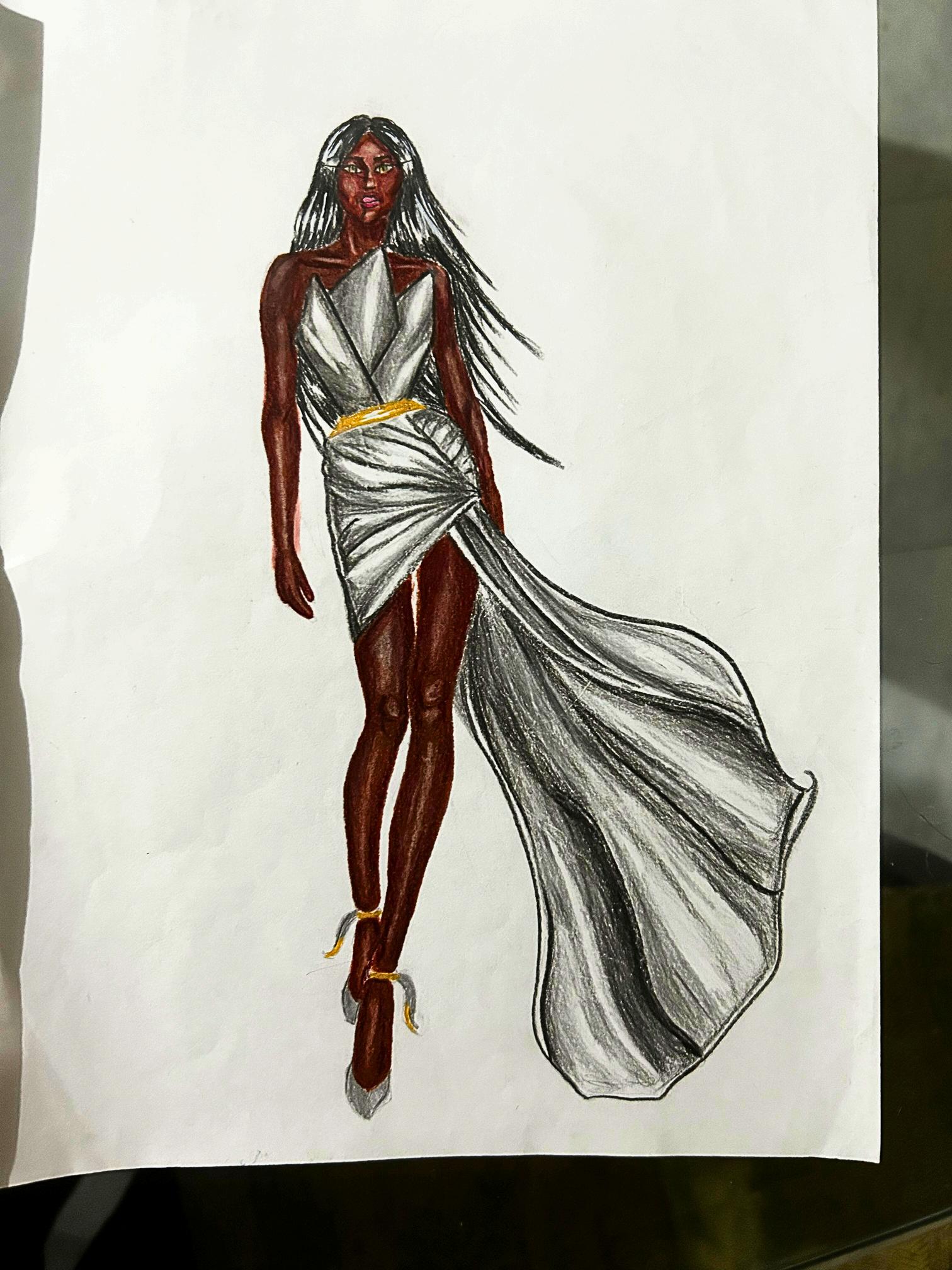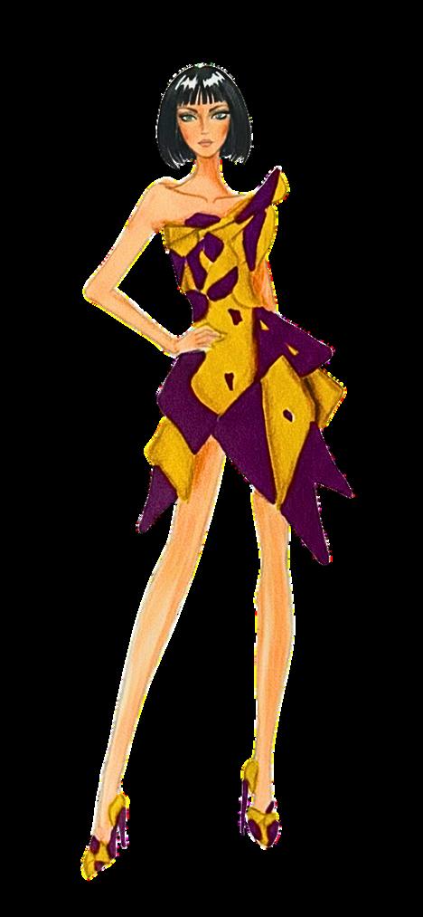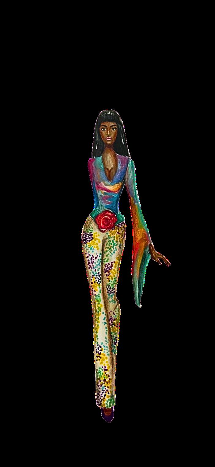 Este figurín se inspira en la estética orgánica y fragmentada de Antoni Gaudí para manifestar una intensa psicología del color. El diseño busca evocar creatividad, fantasía y conexión con la naturaleza.