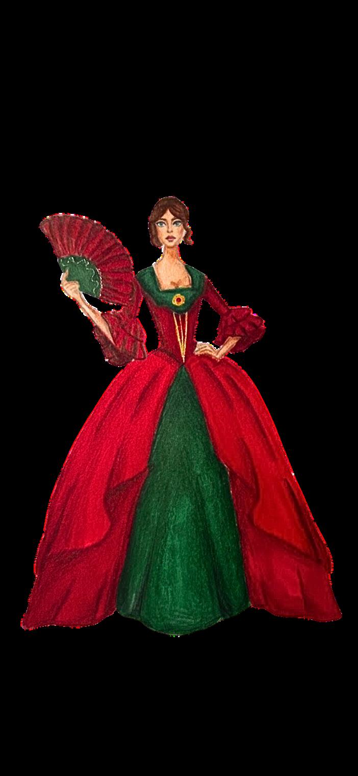 l atuendo que observamos en la ilustración es un magnífico ejemplo de la moda barroca y rococó que floreció en los Virreinatos de la América española durante los siglos XVII y XVIII.