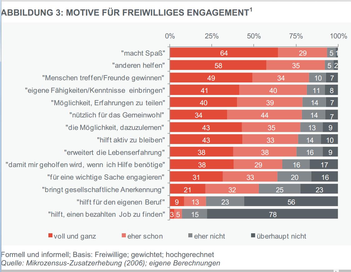 […] Enorme 46 % der Bevölkerung ab 15 Jahren betätigen sich freiwillig und leisten damit einen unverzichtbaren Beitrag für den Zusammenhalt in unserer Gesellschaft und unsere hohe Lebensqualität. Das sind mehr als 3,3 Millionen Menschen in Österreich, die sich freiwillig engagieren. In Organisationen und Vereinen sind rund 2 Millionen Menschen unbezahlt aktiv tätig. Freiwilliges Engagement bietet unserer Gesellschaft einen Mehrwert, ist aber kein Ersatz für bezahlte Arbeit.