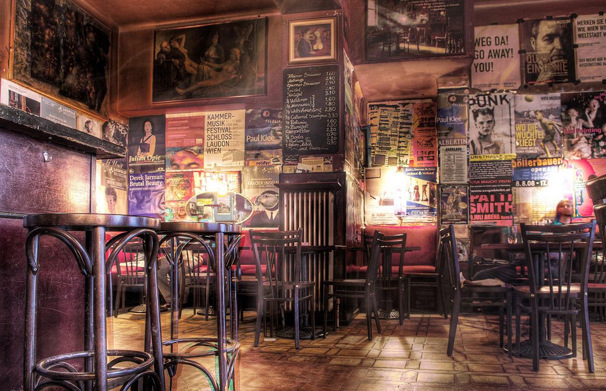1: ein Beisl (hat länger offen); 2: ein Kaffeehaus; 3: ein Pub; 4: beim Kebabstand; 5: im Schanigarten;
