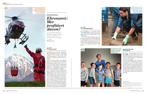 Österreich ist ein Land des ehrenamts: 46 Prozent der über 15-Jährigen engagieren sich freiwillig. Damit liegt Österreich doppelt so hoch wie der eUSchnitt (23 Prozent) und auf Platz 1 in europa. 58 Prozent geben in Wien an, freiwillig zu arbeiten. Die Hauptstadt liegt damit im Bundesländervergleich ganz vorne. Das ist auf den hohen Anteil an informellem engagement zurückzuführen, etwa bei der Pflege von Angehörigen, Reparaturen oder privater, unbezahlter Nachhilfe. Platz 1 in der formellen Freiwilligenarbeit geht an Salzburg. 39 Prozent sind dort in Organisationen und Vereinen aktiv. Auf Platz 2 folgt tirol mit 33 Prozent, Schlusslicht ist Niederösterreich mit 17 Prozent. 256.000 aktive Mitglieder hat die Feuerwehr als größte Freiwilligenorganisation. Die Caritas kann auf 27.000 und das Rote Kreuz auf 56.000 ehrenamtliche zurückgreifen. Sie und die zahlreichen engagierten in anderen Sozial- und Rettungsorganisationen sorgen für eine hochwertige und dichte Versorgung der Bevölkerung.