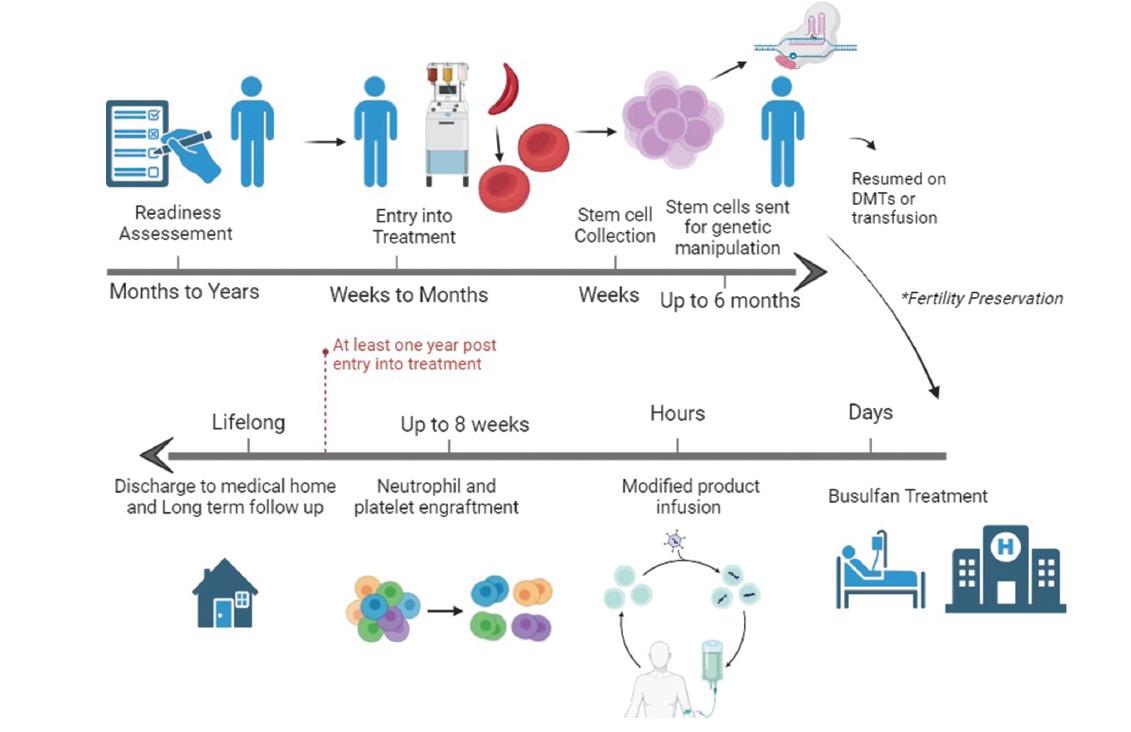 • Overview: autologous hematopoietic stem cells are collected from patients with SCD and genetically modified ex vivo to reduce sickling tendency before reinfusion1