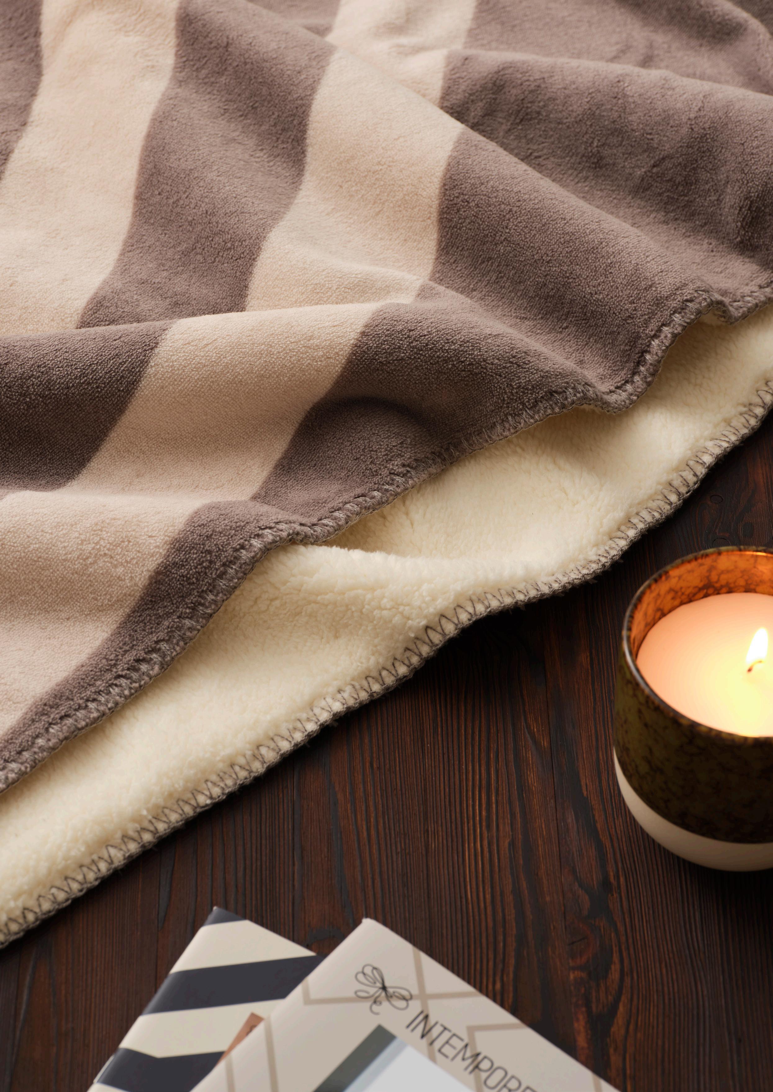 Sherpapläd i den ultimata kombinationen av tidlös elegans och underbar komfort. Med sin fluffiga fleece på ena sidan och mjuk polyester på den andra erbjuder pläden en oemotståndlig hög mysfaktor, gramvikt på hela 500gsm. Den generösa storleken på hela 130x180cm gör pläden till en favorit i TV-soffan eller som en elegant inredningsdetalj på sängen eller i vardagsrummet.