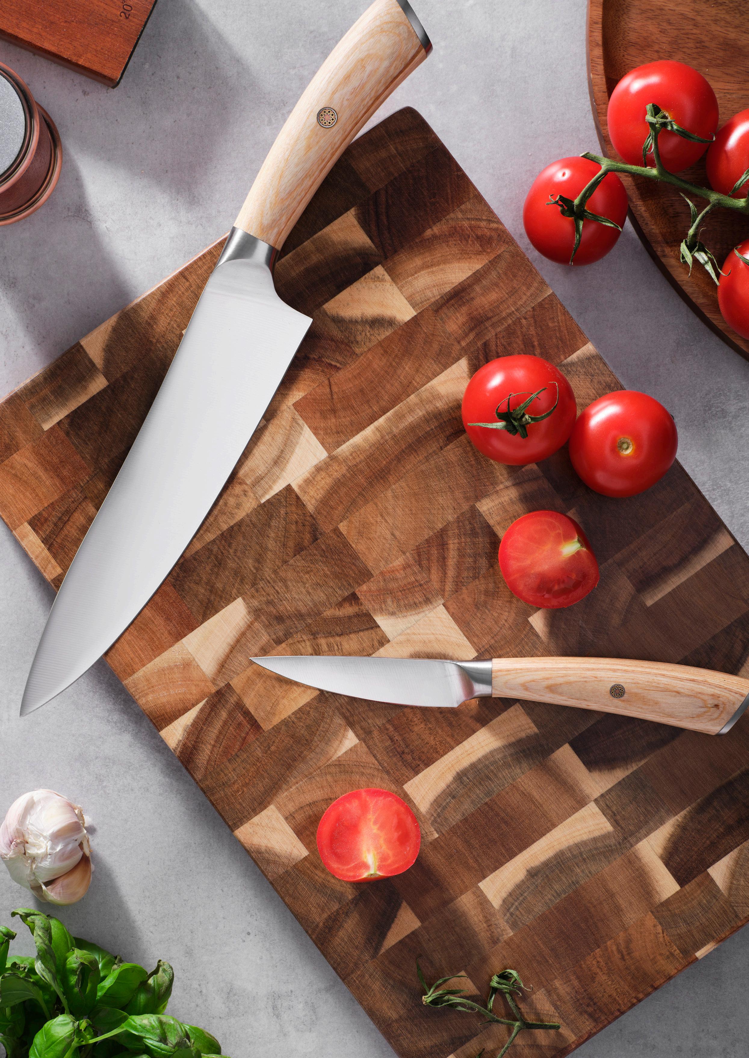Tillverkade i hållbart 8CrMoV14-stål med utmärkt skärpa, korrosionsmotstånd och slitstyrka, är de skapade för att prestera. Kockkniven hanterar enkelt större råvaror som kött, fisk och grönsaker, medan skalkniven ger precision vid mindre uppgifter som att skala, putsa och snitta. Bladet på kockkniven mäter 20 cm och skalknivens blad 9 cm.
