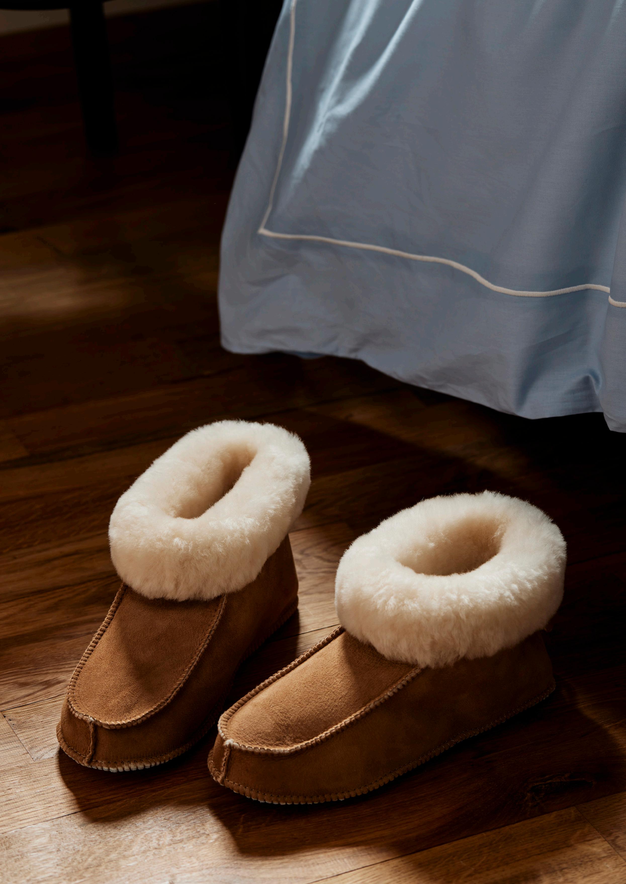 Exklusiva tofflor tillverkade av finaste fårskinn. Tofflor erbjuder härlig komfort och värme, perfekta för kalla dagar och mysiga kvällar hemma. Den ankelhöga designen pryds av en bred fårskinnskrage som omfamnar dina fötter. Den mjuka sulan i mocka säkerställer en bekväm och halkfri gång. Levereras i en elegant skopåse av bomull.
