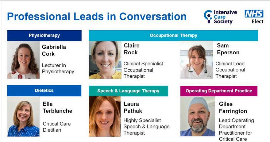 The Society represents all parts of the multi-professional team that deliver care for patients and we have been working closely with our ProfAdvisoryGroups–ourPAGs–particularlytheAHP,PTandAPCCPAGscollaboratingwithNHSElecttobuildonourAHPCriticalCare ProfessionalDevelopmentFrameworkfrom2018-andassociatedpillars