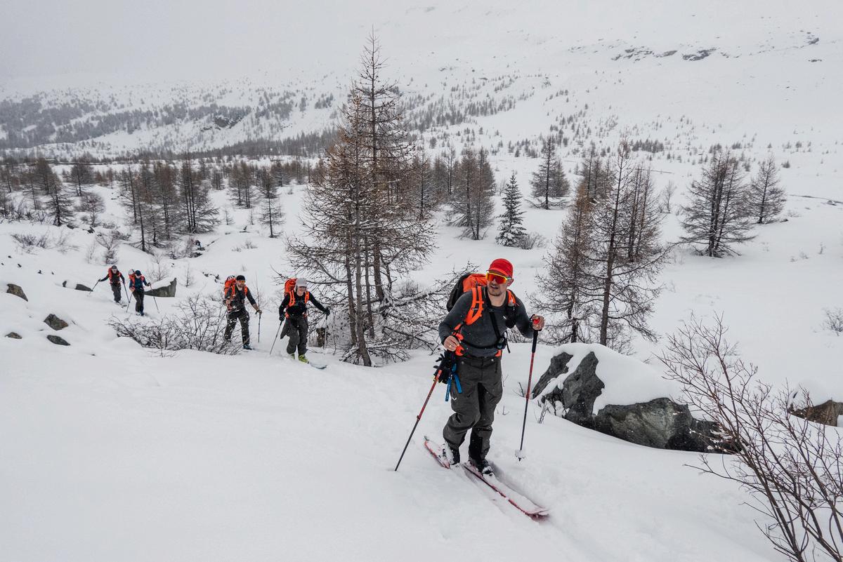 With bad weather and a high avalanche risk we set out a day later than planned, Walking through the streets of Zermatt with all of our gear and ready to go there was a sense of anticipation and excitement at our imminent adventure We crossed several avalanche debris fields and encountered an active avalanche on our final traverse across the mountaintotheSchönbeilHut ourhomeforthenightat2694melevation andwithdramaticviewsofthenorthfaceoftheMatterhorn