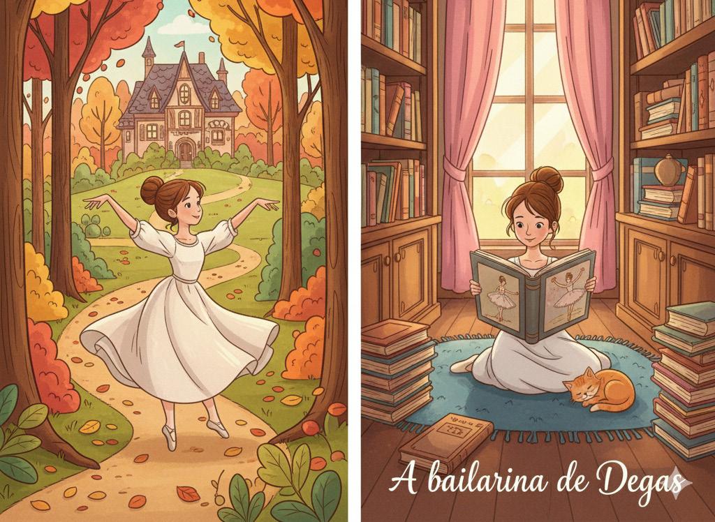 A casa era grande e tinha um jardim. Para lá do jardim ficava o bosque de árvores imensas que se estendiam até não poderem ser mais vistas, por entre caminhos traçados sob as folhas do outono. Telma adorava passear-se pelo bosque. Corria pelos caminhos, inventava outros atalhos e tentava passos de dança, braços ondulando ao sabor de melodias imaginadas. Ser bailarina era um sonho só seu. Desde que descobrira, na biblioteca, um livro com reproduções de quadros célebres, e, nas suas páginas, umas pinturas de bailarinas, a ideia que até então lhe passara vagamente em seus pensamentos tornou-se numa vontade constante, doentia. Por isso, se dividia Telma entre os passeios pelo bosque e as visitas à biblioteca. As grandes prateleiras repletas de livros tinham-na assustado, no início.