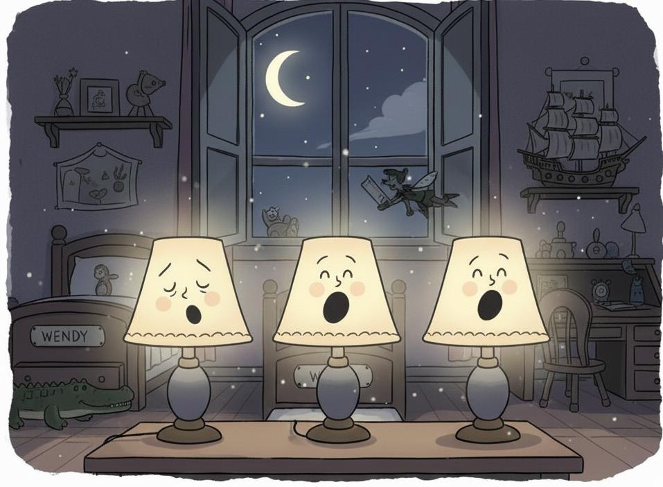 Mesmo depois que o senhor e a senhora Darling saíram da casa, os três abajures no quarto das crianças continuavam acesos. Eram três lindas luzinhas que fariam qualquer um desejar que as crianças estivessem acordadas para ver Peter chegar. No entanto, o abajur de Wendy piscou, bocejando tão profundamente que os outros dois abajures também bocejaram. Antes de fecharem a boca, os três já tinham se apagado.
