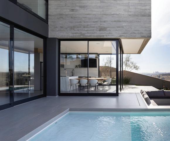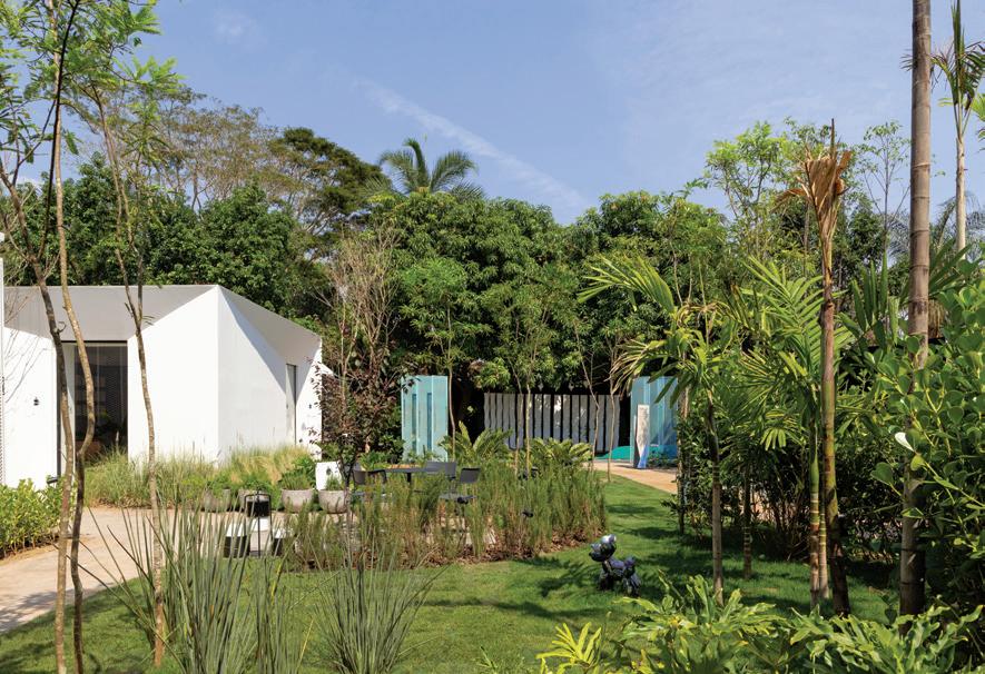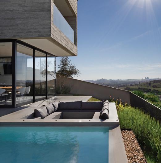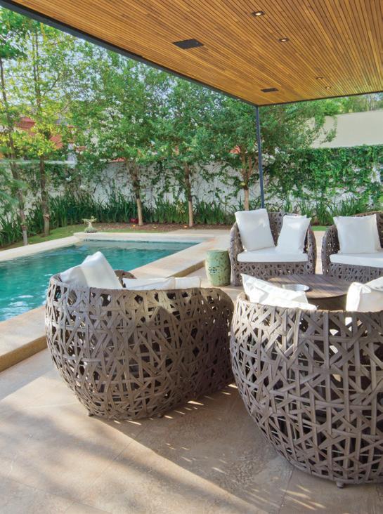 A imponente fachada, na página ao lado, foi envolta por um belo paisagismo no qual o contraste do verde fica evidente com os tons pastéis da textura usados na área externa. A sustentabilidade foi um ponto chave do projeto. Painéis solares foram adicionados garantindo assim, economia e consciência ambiental. No telhado, telhas cimentícias reforçam os cuidados entre estética e acabamentos. Na área externa, para dar ainda mais amplitude, o anexo da casa é integrado à área da piscina por uma esquadria de alumínio piso/teto. Na piscina, o jogo de textura em tons de azul dá ainda mais movimento e dinamismo. Os móveis externos da Copav dão o toque final à composição