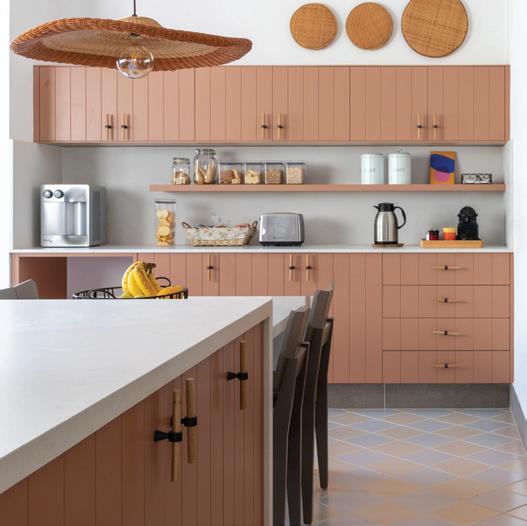 Na cozinha, o piso que remete às cerâmicas antigas ganhou rodapé de porcelanato (ambos Casa Rara Acabamentos). A bancada gourmet tem tampo em quartzo e uma mesa é acoplada a ela. O lustre rústico trançado à mão foi trazido da Amazônia. Os móveis sob medida têm como destaque o tom coral com acabamento que remete ao lambri