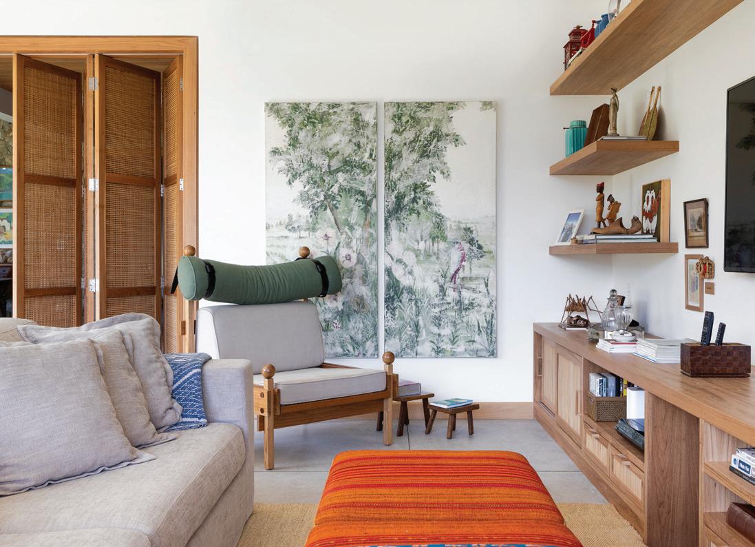 Na foto acima, destaque para o sofá em tom neutro e a poltrona assinado por Sérgio Rodrigues. O pufe alaranjado quebra a sobriedade da composição e sugere um visual despojado. Os móveis, as decorações e o tapete garimpados. Na mesma paleta de cores, a dupla de quadros passeia entre o branco e o verde. Como destaque, a porta camarão, em madeira com detalhes na mesma vareta de cavilha das portas, reforçando o visual rústico com um toque praiano. O piso é de cimento queimado. No lavabo, ao lado, a bancada tem cuba em Limestone e torneira da Casa Rara Acabamentos. A parede foi pintada na cor Relva Verde da Coral, revelando um toque contemporâneo na composição