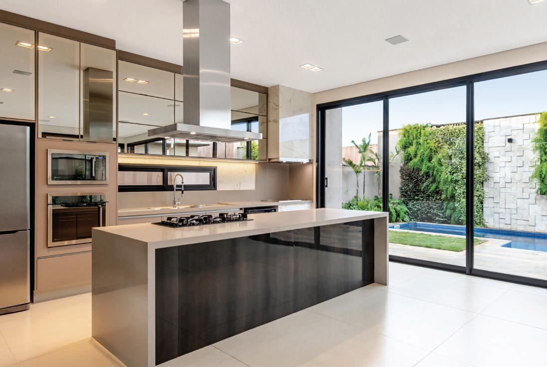 O espaço gourmet tem piso em porcelanato em tom claro que harmoniza com o acabamento dos móveis sob medida e do material escolhido para as bancadas e ilha, o quartzito. A iluminação tem luminárias (City Iluminação) embutidas no gesso, a coifa e a churrasqueira (Máxima Gourmet) têm acabamento inox e combinam com os demais eletros. As amplas esquadrias (Kaza Primory) permitem a conexão total com a área externa, onde o paisagismo se destaca no entorno da piscina com piso amadeirado, deixando em evidência o revestimento de pedras (Pietra Galeria de Pedras) do muro