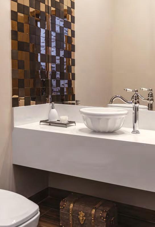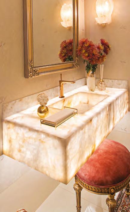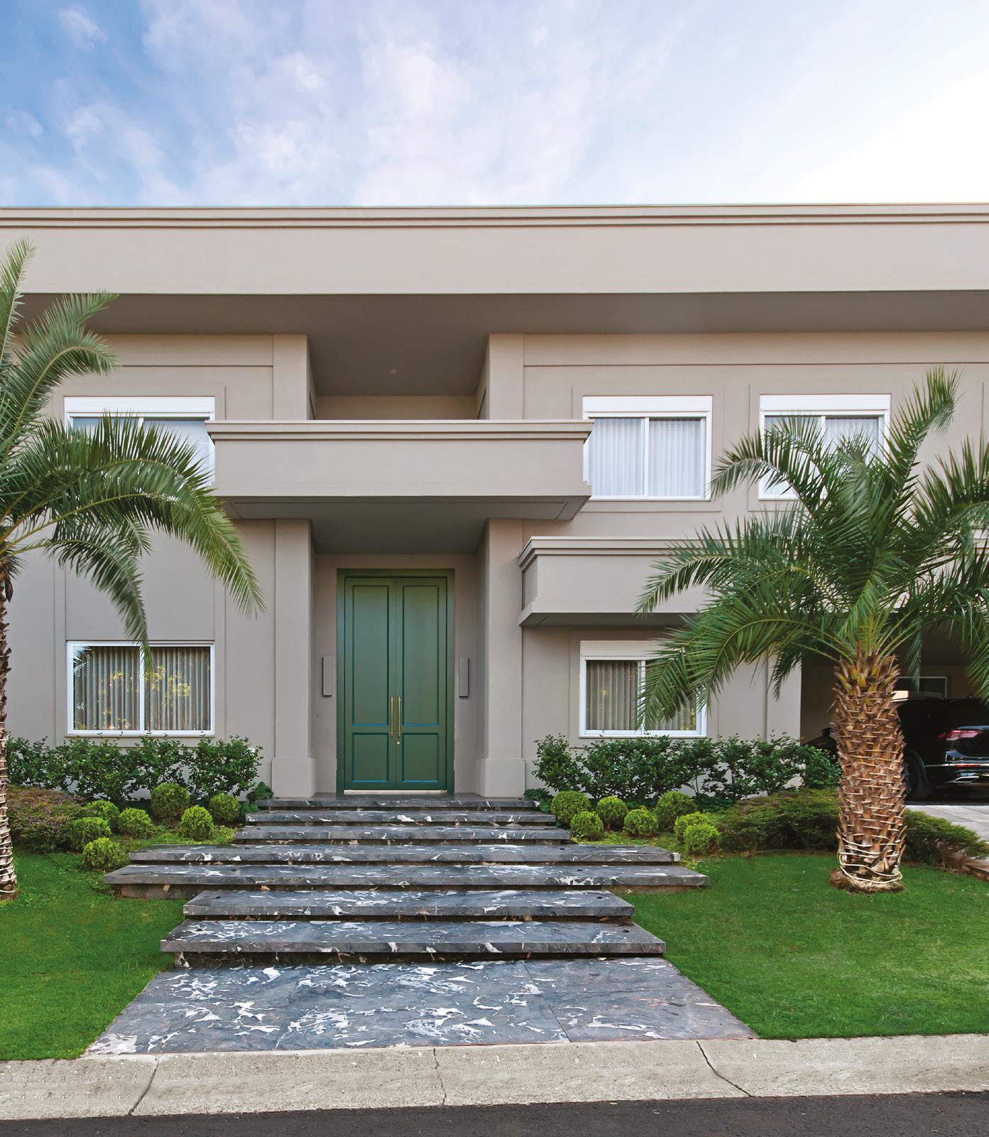 Na página anterior, o lavabo com piso em Mármore Calacata Gold Michelangelo e cuba em Ônix iluminada (Stone Center), torneira Red Gold Deca (Ornamentare), espelho D'água e vaso Cinquenta da designer Jacqueline Terpins (Jackie Móveis) e apoio em vidro (Vidroglass). Os quadros são da um618 encontrados na Jackie Móveis e as decorações da Krieê Decorações. Nesta, a fachada clássica com tintas e texturas da Dantecolor, molduras em EPS da Requint Molduras, paisagismo assinado por Flávia Seixas com plantas da Verdeplan e acesso com degraus em mármore Grigio Michelangelo (Stone Center). As esquadrias de alumínio são da Projesp