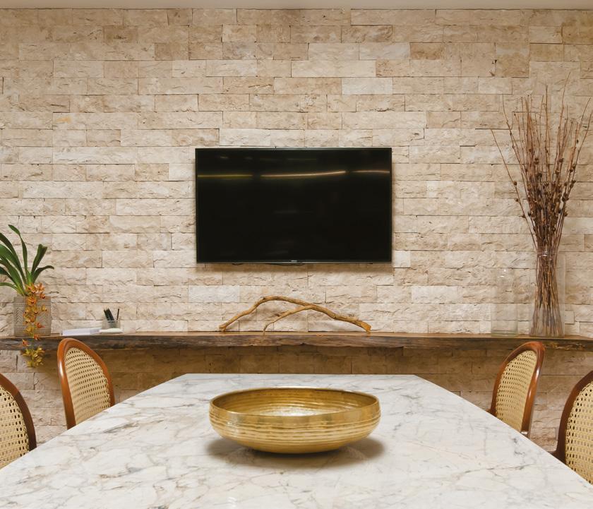 No detalhe da recepção, no alto, à esquerda, o destaque fica para iluminação embutida a marcenaria da estante que mantém a conexão entre a sala de reunião e a área do escritório. A pintura é da São Geraldo Tintas. No banheiro, a única intervenção feita foi a cuba de mármore (Marmoraria São Jorge) e as persianas de madeira (Casa Versátil). Os azulejos Brennand da parede são originais e rementem ao artesanato brasileiro. Na sala de reunião , acima, a opção foi usar uma mesa em mármore Calacatta Gold (Marmoraria São Jorge), e parede revestida com Travertino Rockface (Pedregal) e prancha de madeira rústica como um aparador de suporte