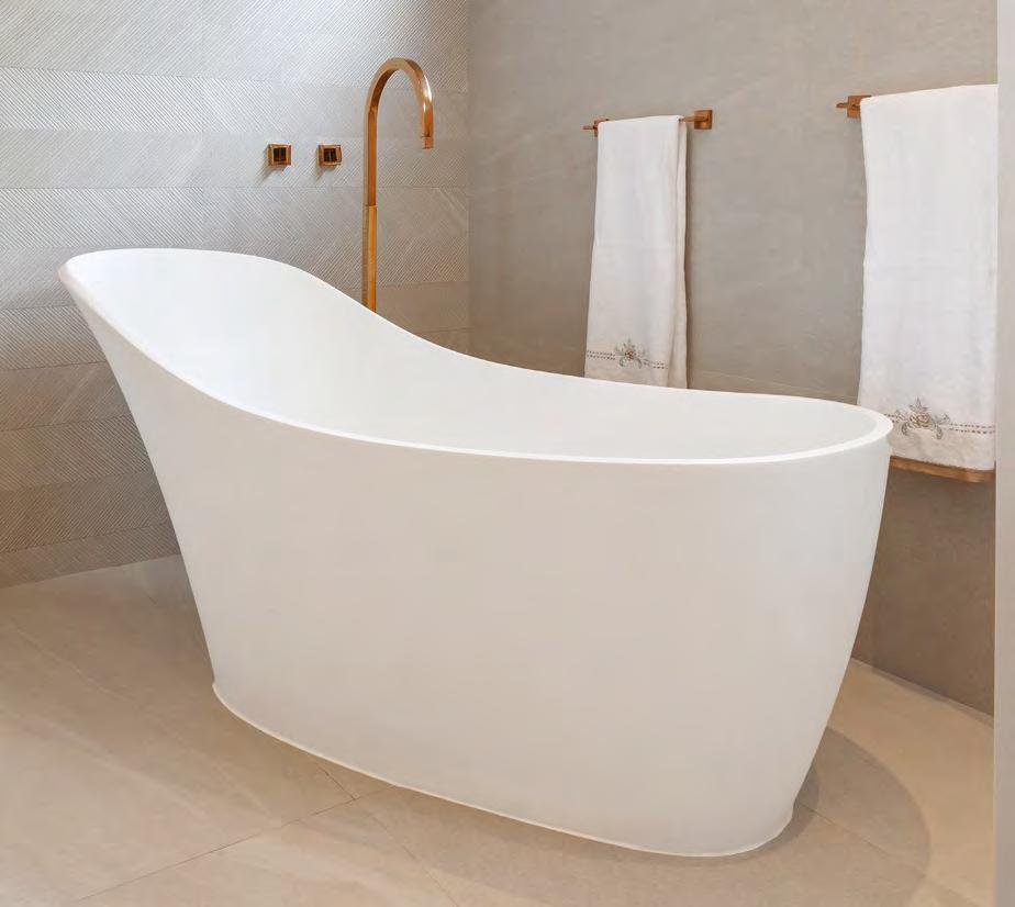 01| Porcelanato Gaya Green, da Villagres, encontrado na Casa dos Construtores; 02| Da Ornamentare, a Cuba Gota da Deca; 03| Revestimento ripado concrete, da REV Brazil; 04 | A banheira Celine é um dos destaques da Riolax; 05| Na bancada e área molhada, o quartzito Madrepérola, da Marmoraria São Jorge; 06| Com uma textura mais rústica, o revestimento Rockface Matrix, da Pedregal.