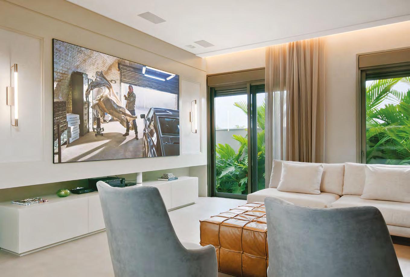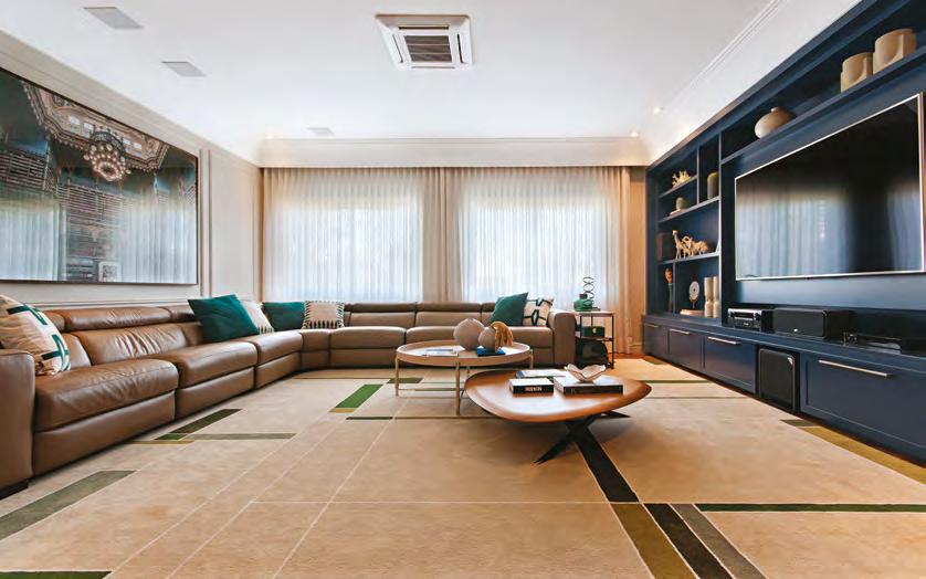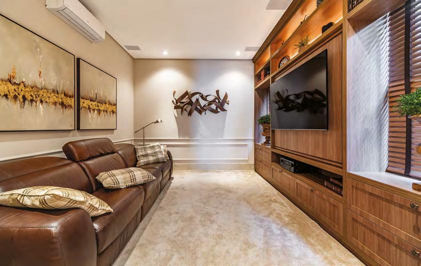 Na última foto, a sala de TV, com marcenaria (J. Marino Móveis) e decorações da Krieê Decorações. As cortinas são da Loja Nova, mesas de centro que inclui o modelo Aral de Ronald Sasson, mesa lateral Zina, de Zanini de Zanine, e quadro um618 (todos da Jackie Móveis), sofá Natuzzi de couro e demais móveis soltos da Perfil Casa